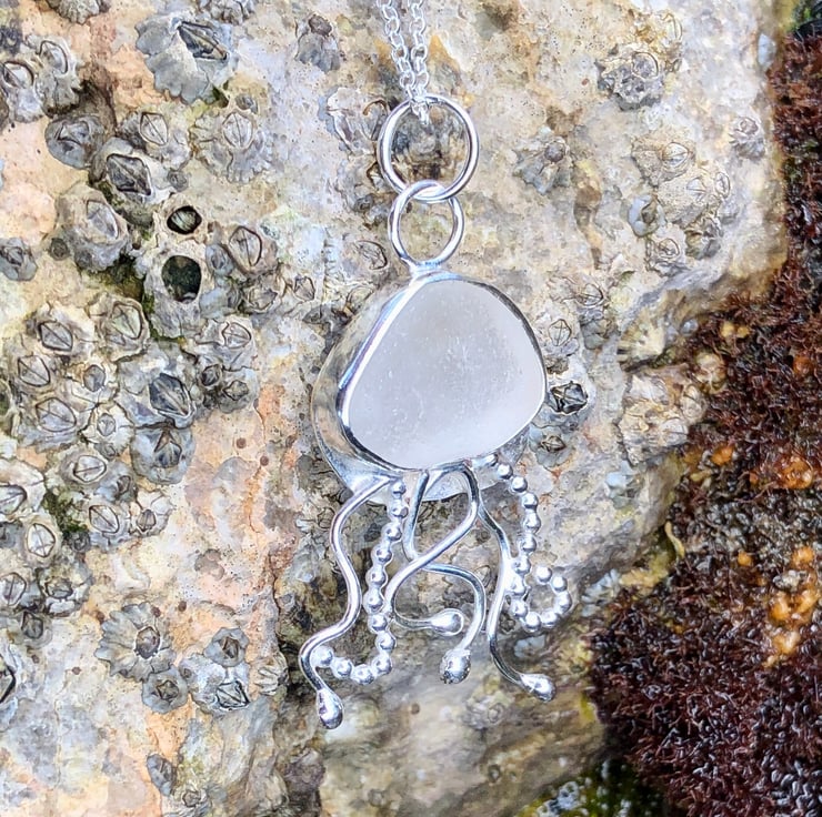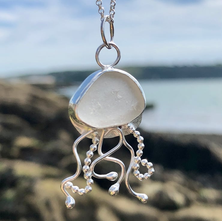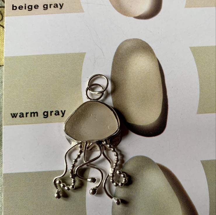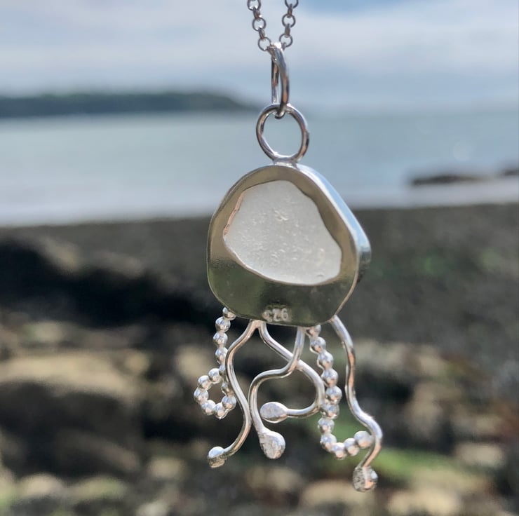 This beautiful piece of warm grey sea glass was found along the UK's South West coastline and has been set in a fine silver bezel (.999) and using recycled (ecosilver) sterling silver wire (.925) to create a beautifully unique Jelly fish pendant. The back of the pendant has been left open so that the gorgeous colour of the sea glass can shine through.