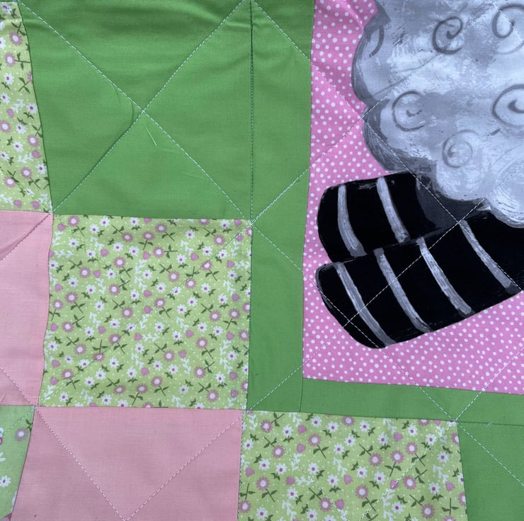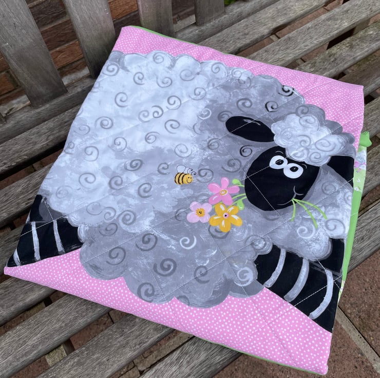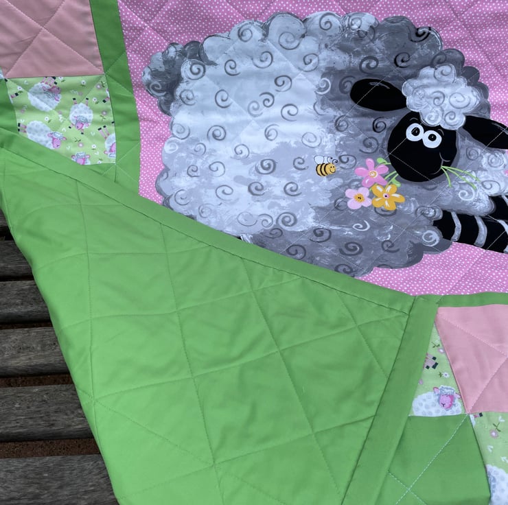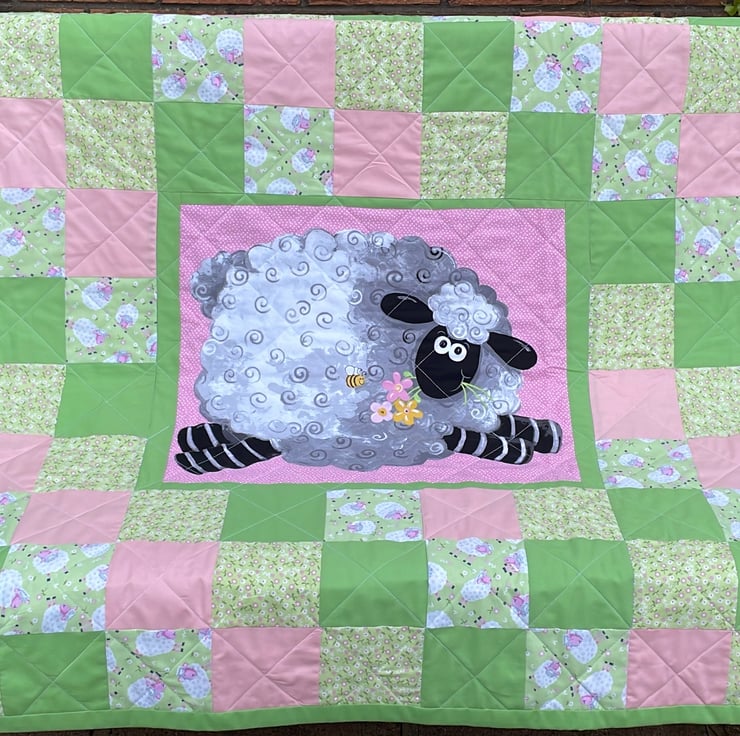 A lovely handmade patchwork quilt made with Suzy Bee’s Lal the Lamb Fabric Panel. Quilt features a cute woolly lamb on a pink and white polka dot fabric in the centre. Panel is surrounded by 4.5 inch patchwork squares in coordinating fabric featuring sheep and flowers in pink and green. Quilt is bound and backed in spring green coloured fabric from the Riley Blake Confetti Cottons range. Wadding is high quality cotton/bamboo blend. Quilt is approximately 41 x 44 ins and would suit toddler bed. Would also make lovely Playmat or Wallhanging or throw for a nursery or child’s room. Would make a lovely baby shower gift or newborn gift.