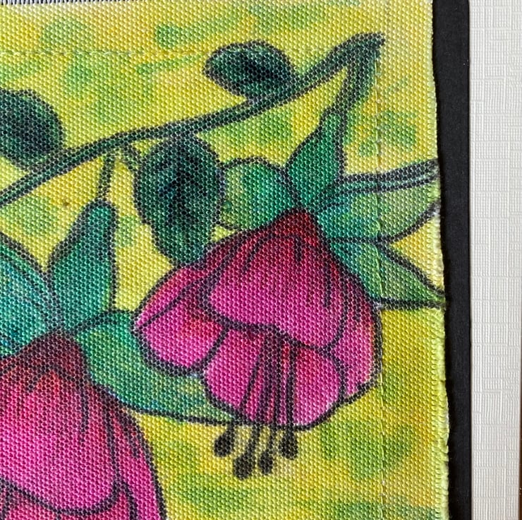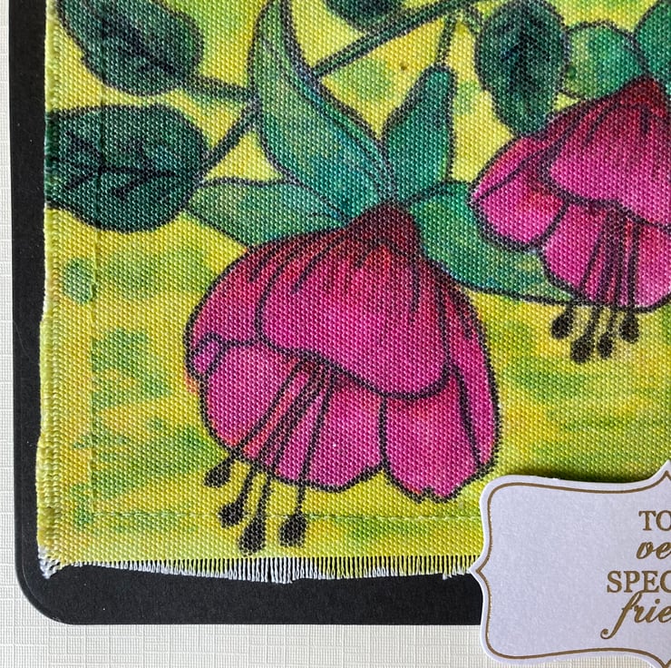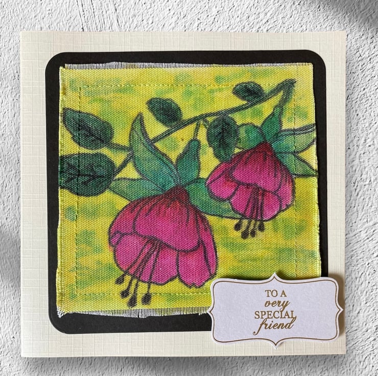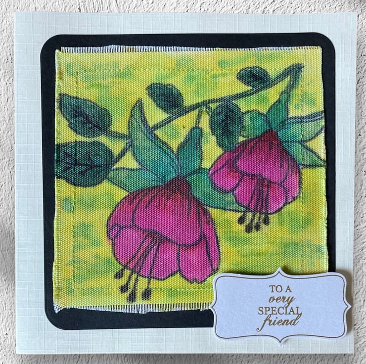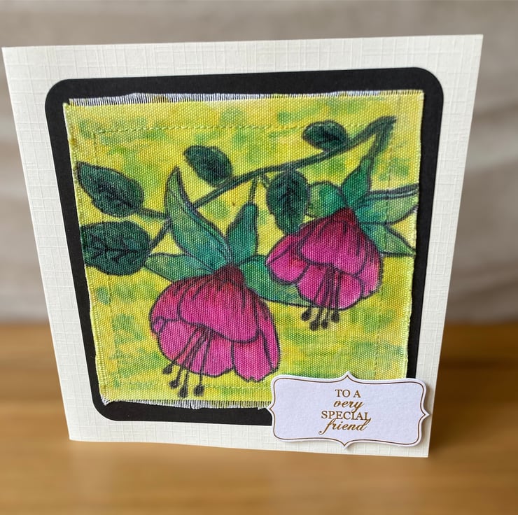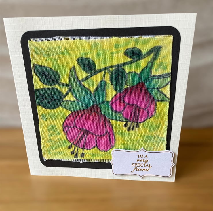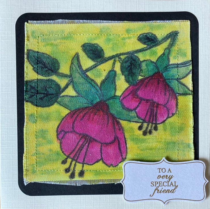 A hand decorated greeting card for a friend. This card features a hand stamped image of fuchsias on a fabric base decorated with alcohol inks. This has been layered onto black card and applied to cream linen card stock.