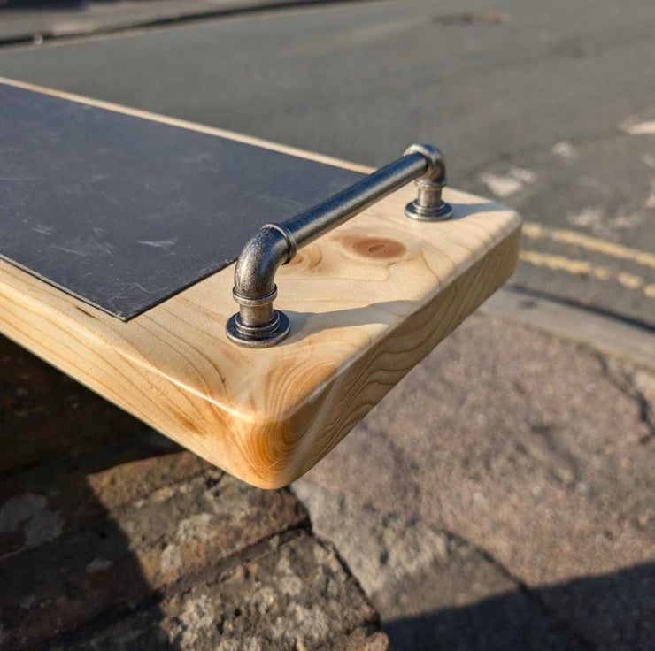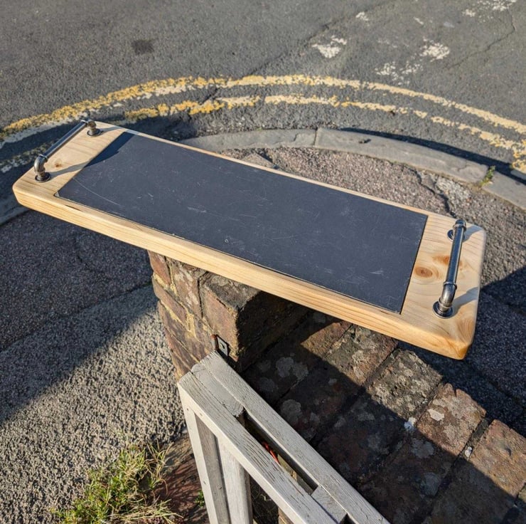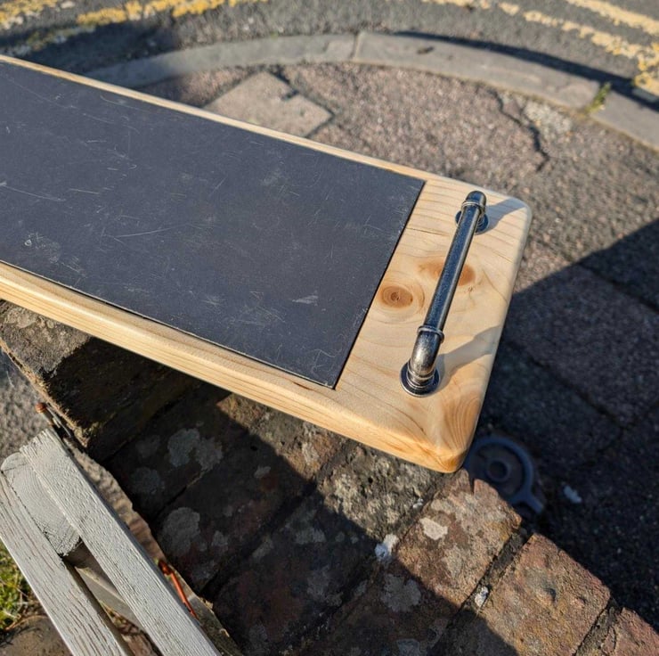 This serving board is made from a recycled scaffold board with a piece of reclaimed slate dropped into it, with pipe like handles (shop bought I'm afraid) to finish it off.