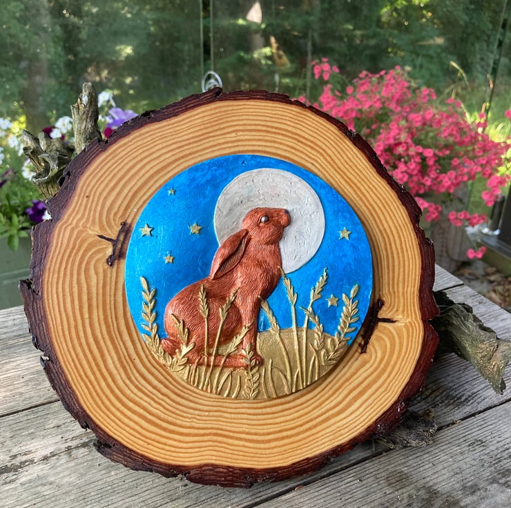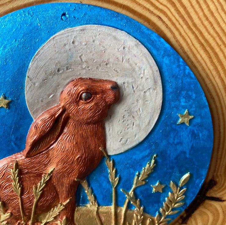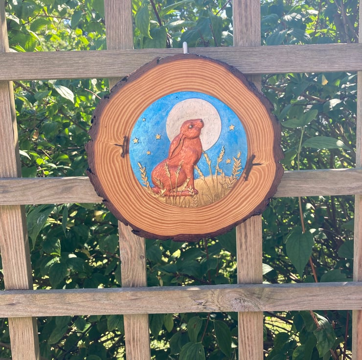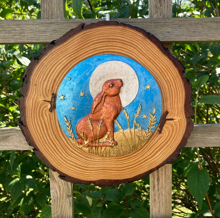 Handmade casting of the beautiful moongazing hare, delicately hand painted and mounted on a slice of wood. Measures approx 20cm diameter with a hanging fixture on the reverse. This is varnished and is appropriate for hanging outside during reasonable weather. I would recommend bringing them under cover during really wet weather.
