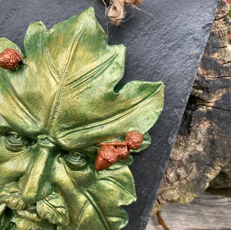The traditional Green Man, pagan symbol of new life, rebirth, fertility (not mandatory!) and all good things. This is cast in jesmonite and mounted on reclaimed roof slate and is suitable for outdoor hanging. A lovely addition to your garden or home. Measures approx 17cm x 10cm, although there is slight variation due to nature of the product. Colour can also vary slightly and we do produce them in different shades of greens and also in copper and bronze, so please contact us if you’d like something different.