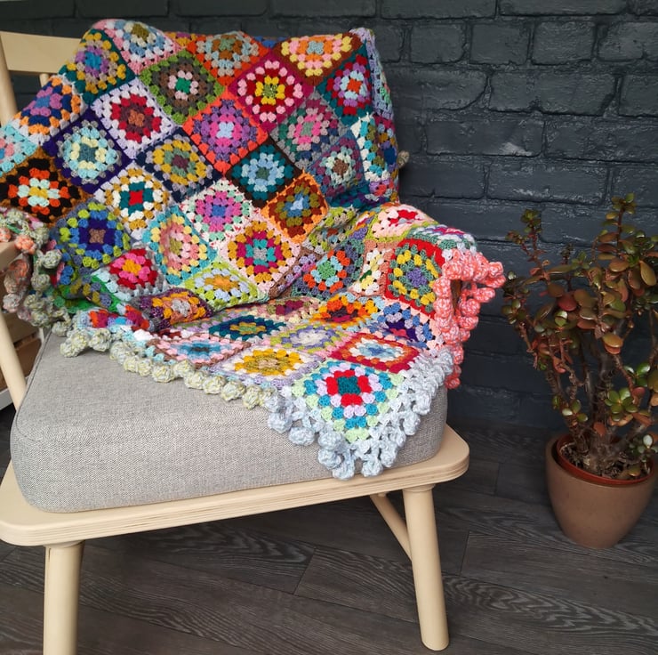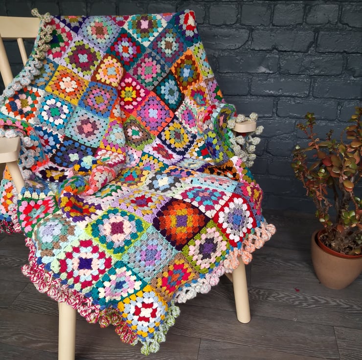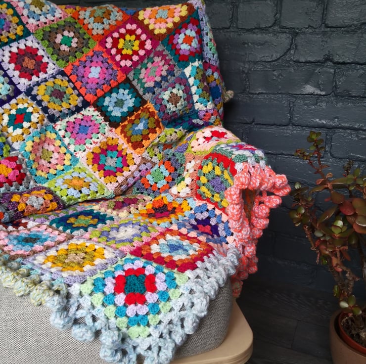 The one thing my ‘Happy Scrappy’ blankets have in common is the giant bobble border. I use 3 strands of yarn at a time and a giant hook to make and I don’t think you’ll find many blankets with a border quite like this!