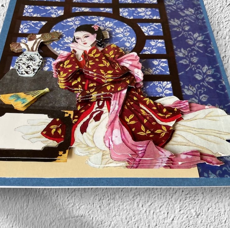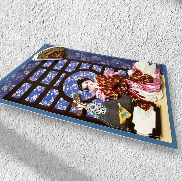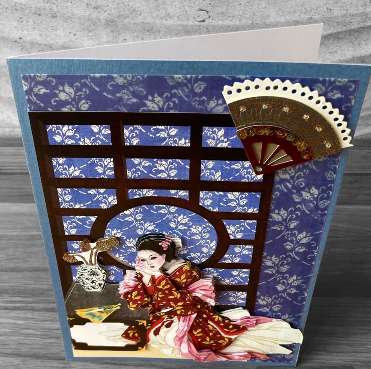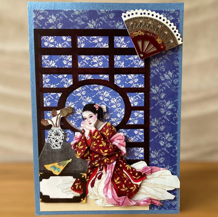 This greetings card features an orient inspired image of a Japanese Geisha which has been applied in layers which have been fussy cut and added on foam pads to give a 3D effect.