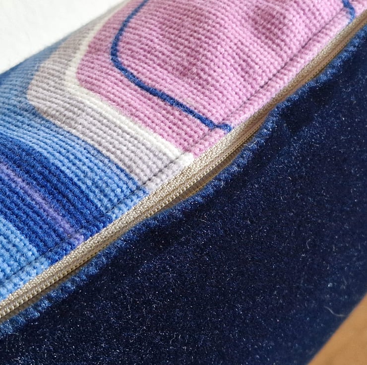 The back fabric is a reclaimed, plain, good quality, dark blue coloured velvet, giving the cushion cover a luxury feel.