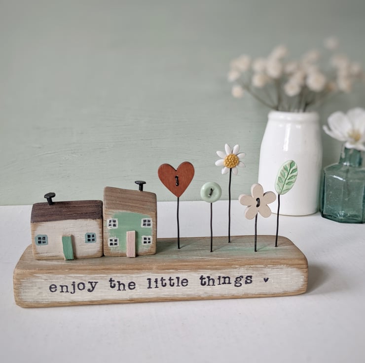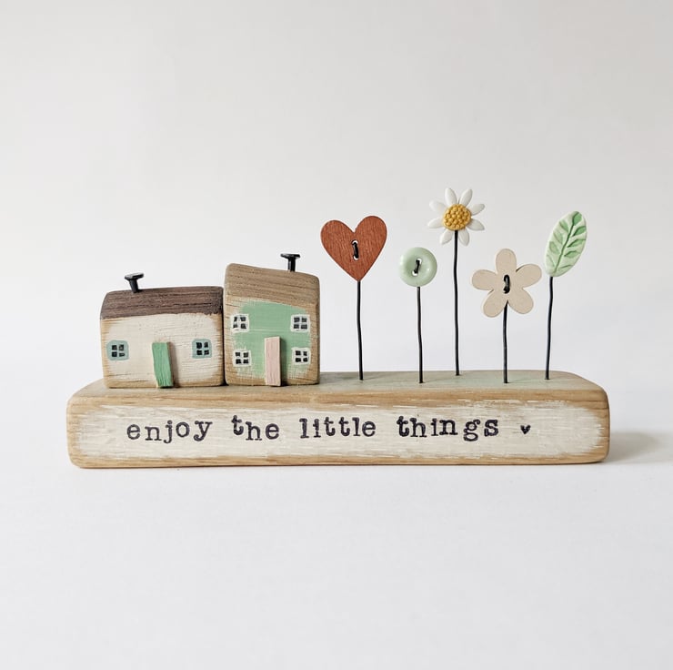 Hand stamped on the front are the words 'Enjoy the little things'.