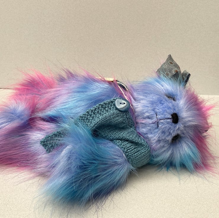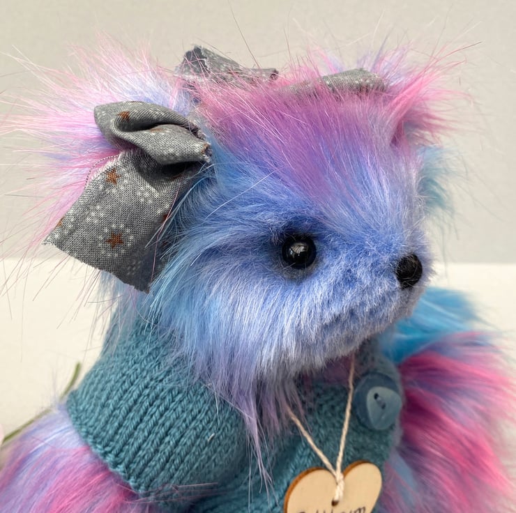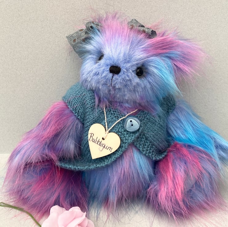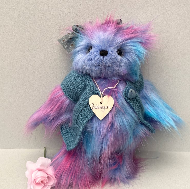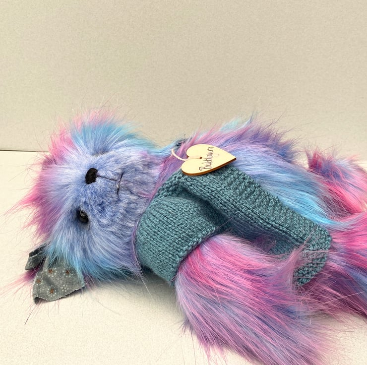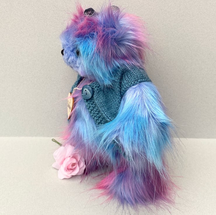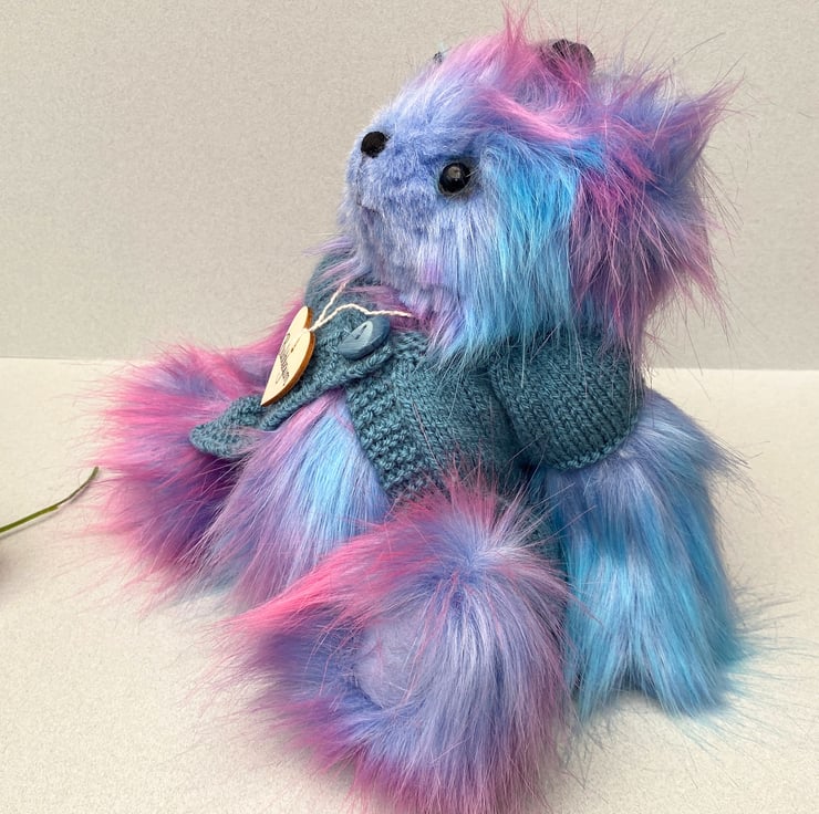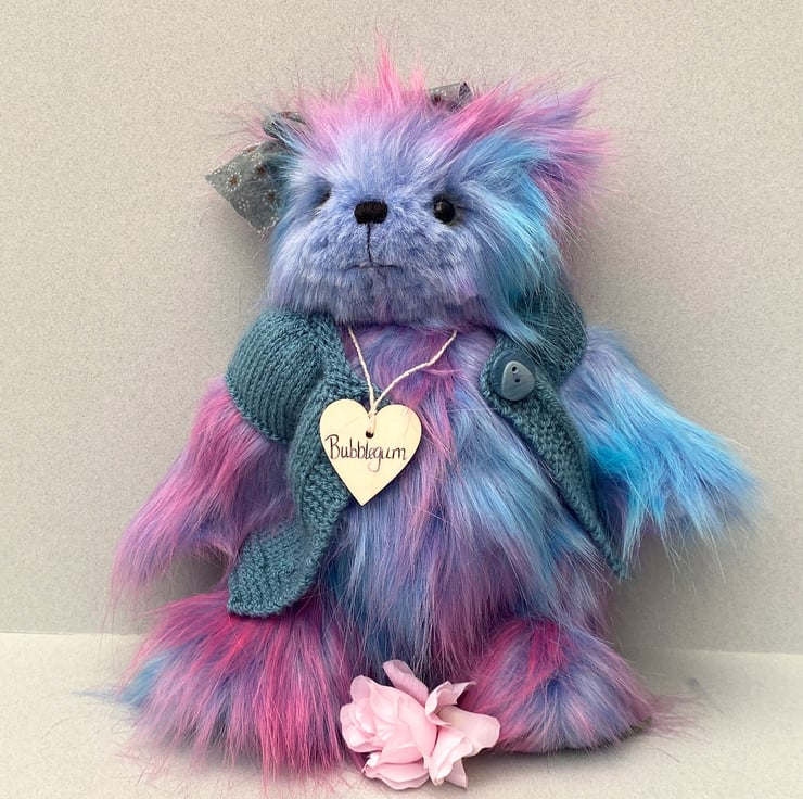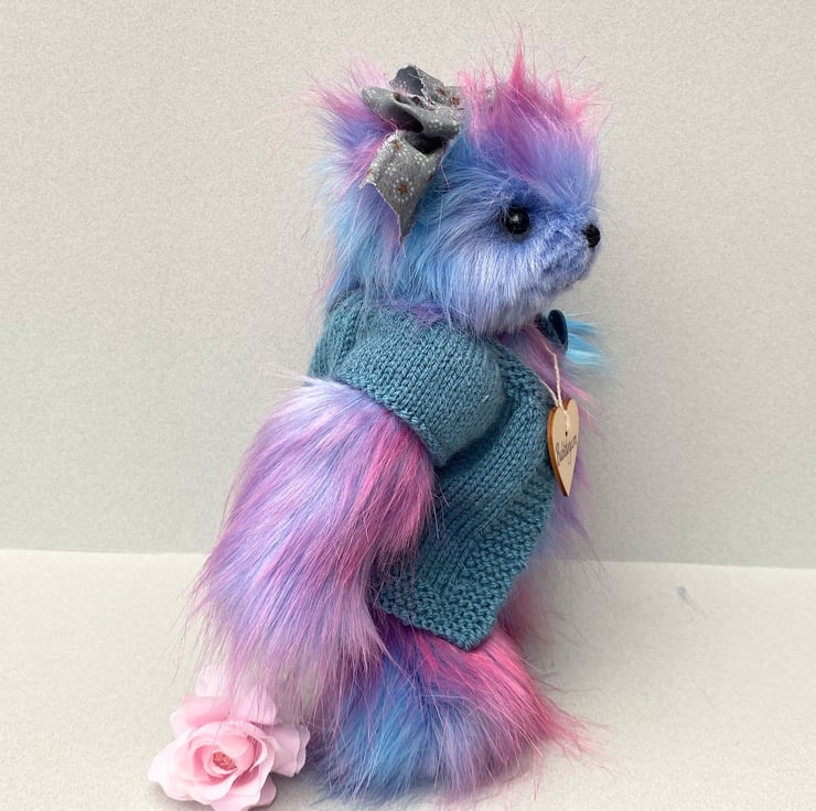 Meet Bubblegum, a beautiful very fluffy artist bear, she stands at approximately 12" tall and is a little bundle of furry fluff. Handmade from a long pile faux fur in a rainbow of blues, cerise pinks and purples.