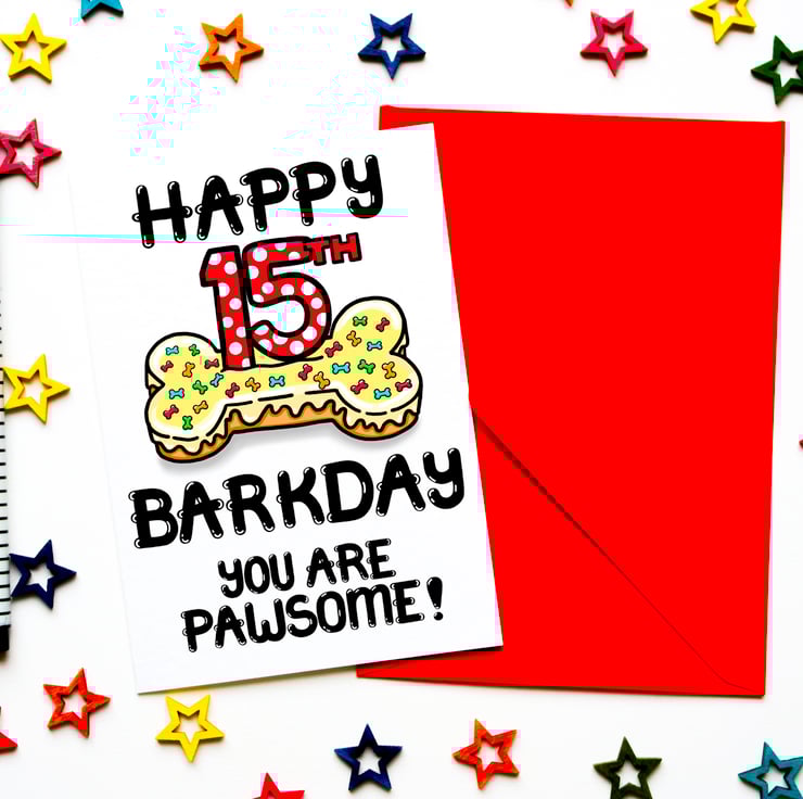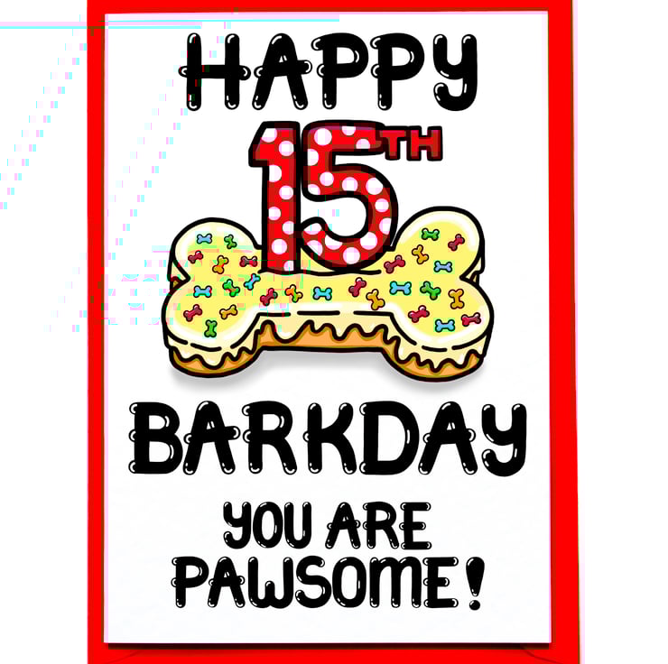 Greeting on front: HAPPY 15TH BARKDAY YOU ARE PAWSOME!