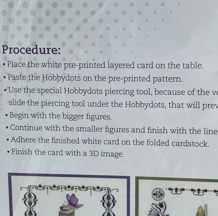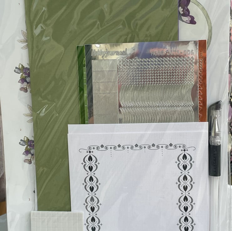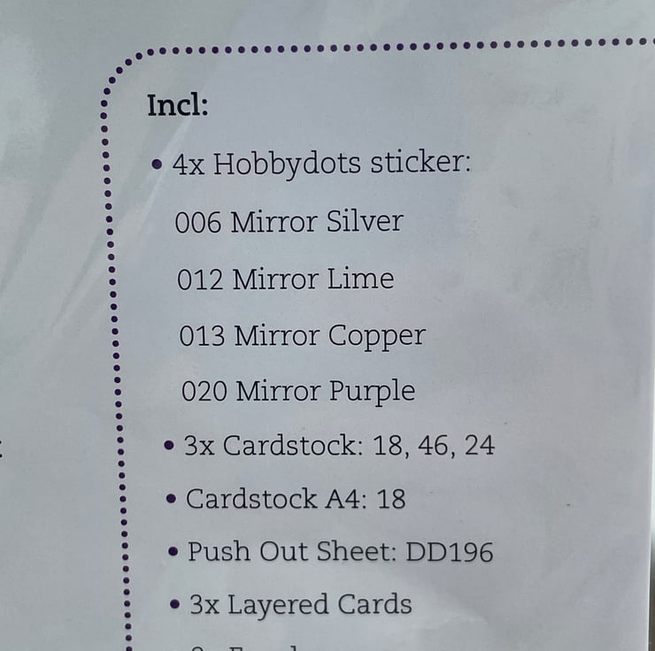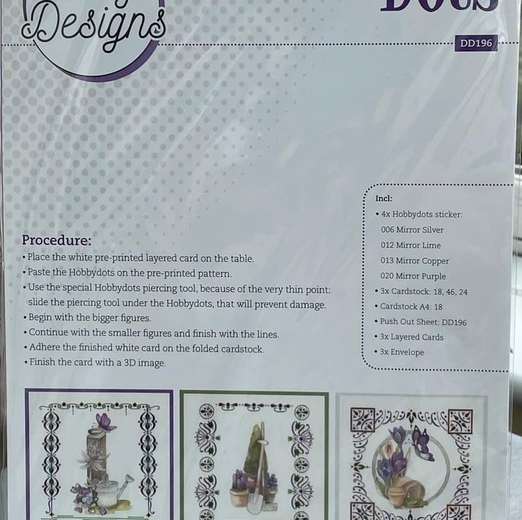 A lovely intricate card kit for a bit of mindful crafting. The Dotty Designs kit makes 3 complete card with envelopes. It contains 3 sheets of hobbydot stickers in 4 colours,3 printed cardstock squares, 1 sheet of A4 cardstock, decoupage sheet, 3 cards and envelopes, a small sheet of 3-d foam and a tool to to add the dots. Full instructions are included on the packet and all tools are included. A mindful way to spend your time.
