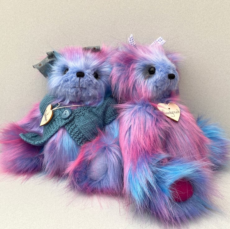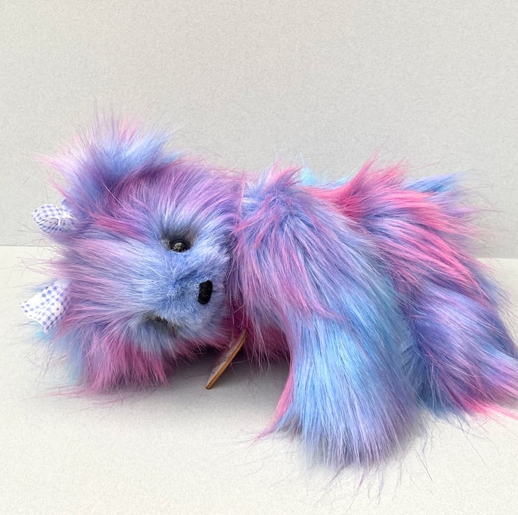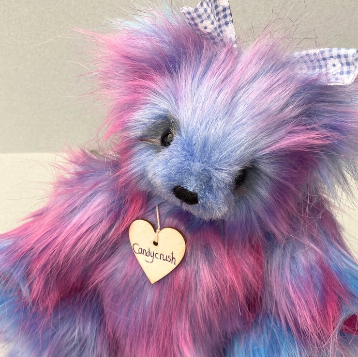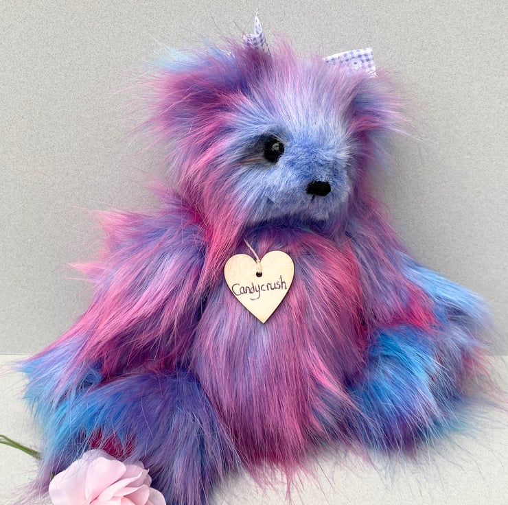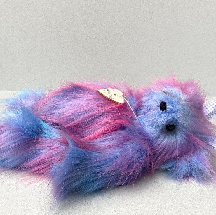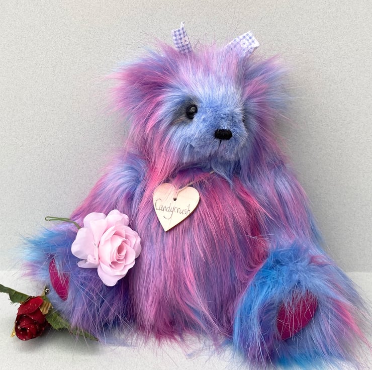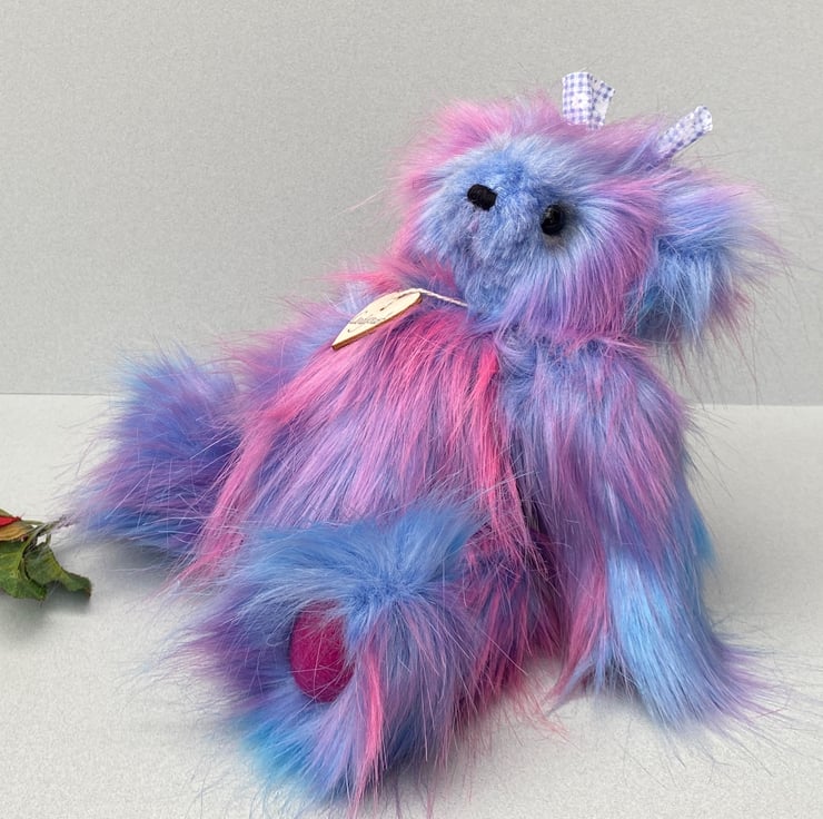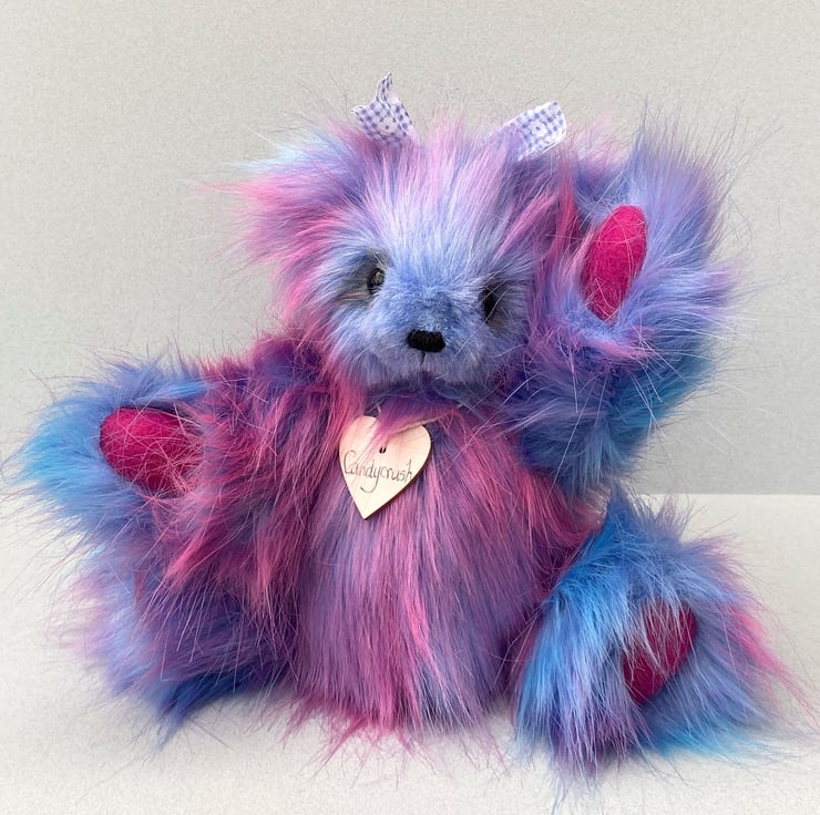 Meet Candycrush, 12" tall long fluffy pile bear, handmade from faux fur in a rainbow of blues, deep pinks and hints of purple. She has wool felt paw pads in deep pink.