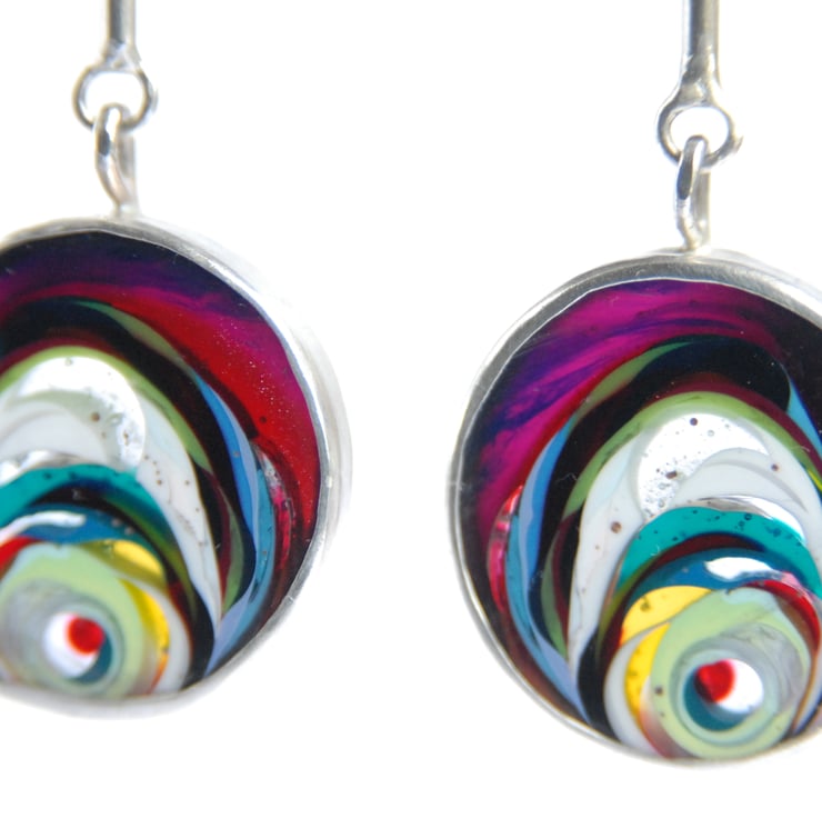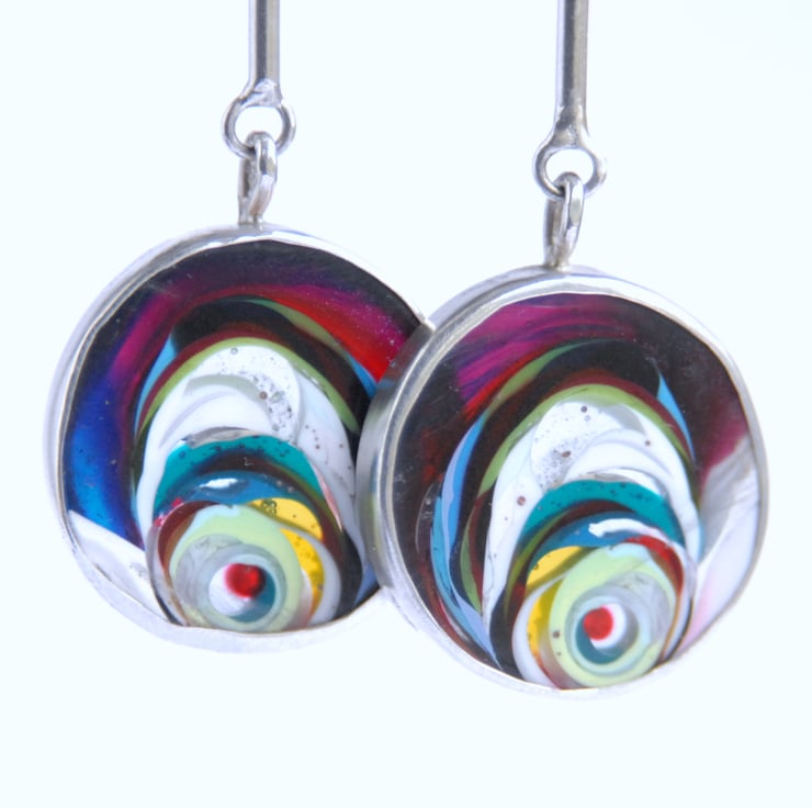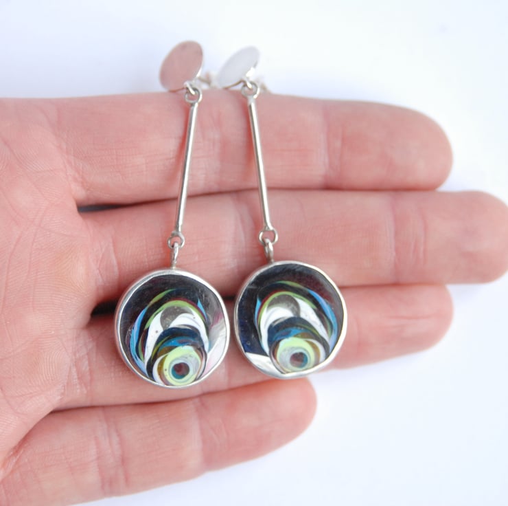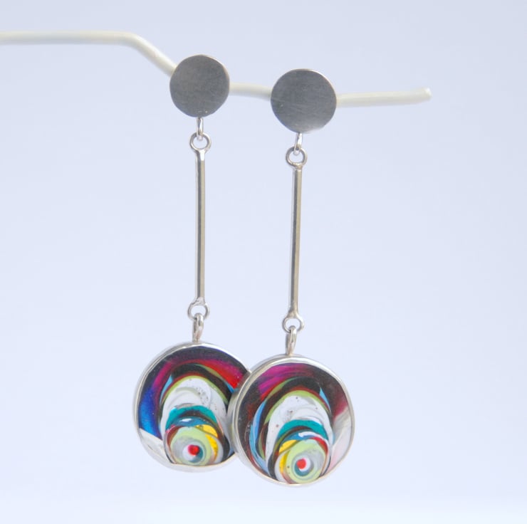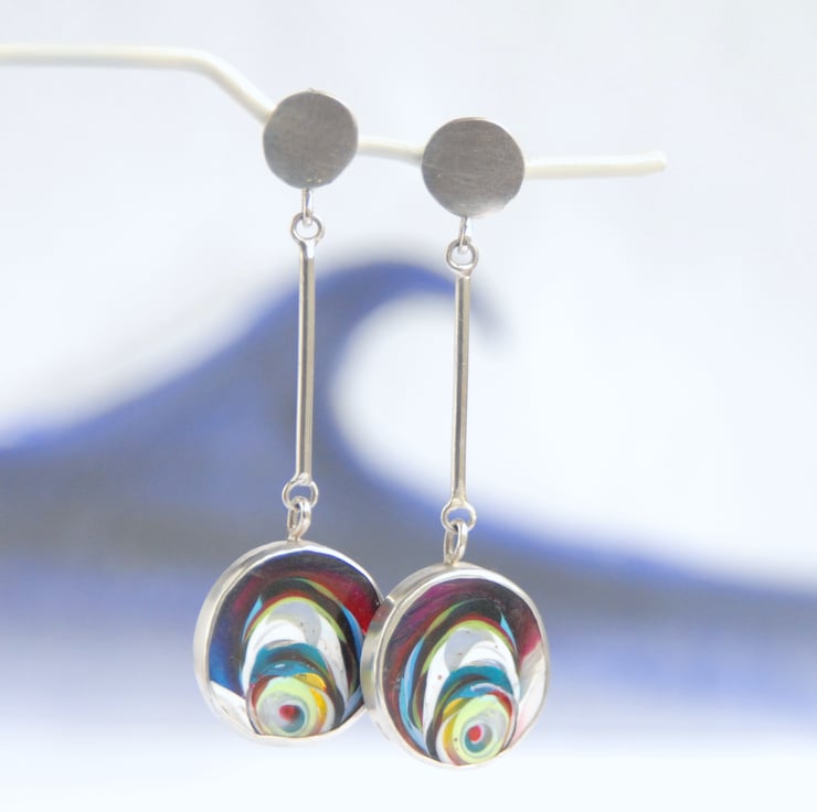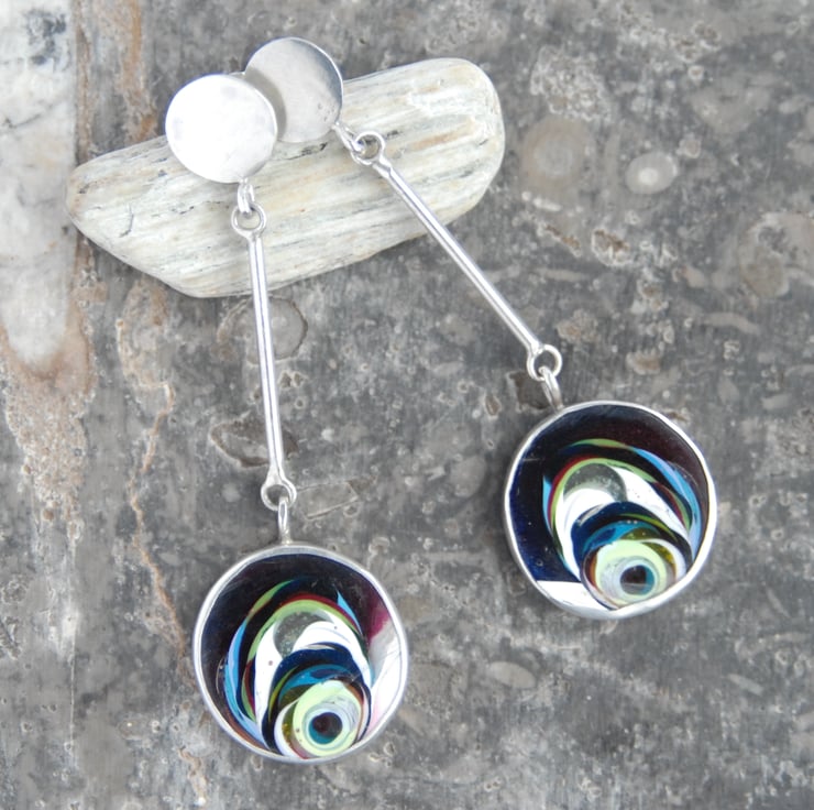 These long drop earrings feature discs of Cornish surfite hanging from a silver bar with a silver disc at the top to hide the post and scroll fitting. I've burnished all the sterling silver so it has a sheen rather than a high shine. The surfite has a swirly 'eyeball' pattern, they are a well matched pair in shades of blue, white, deep red and purple with hints of green, pink and yellow. Some of the colours are opaque but some are translucent, the earrings have an open back so will look different depending on the lighting and whether it is bouncing off the front of the earring or passing through it. The surfite has lots of internal air bubbles and flow lines, the surface has a slight undulation. These long earrings measure 66mm by 21mm, the surfite measures 21mm diameter. Comes gift boxed.