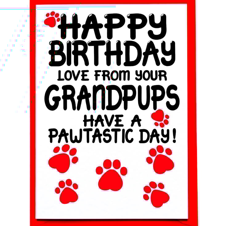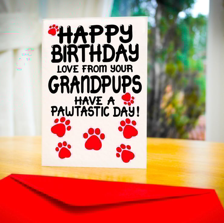 Greeting on front: HAPPY BIRTHDAY LOVE FROM YOUR GRANDPUPS HAVE A PAWTASTIC DAY!