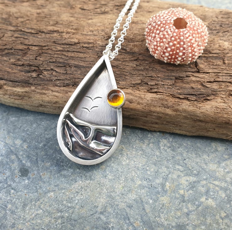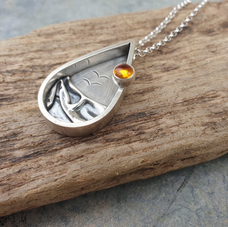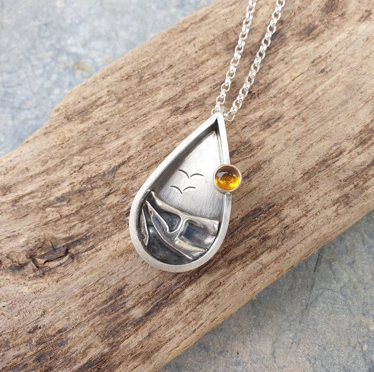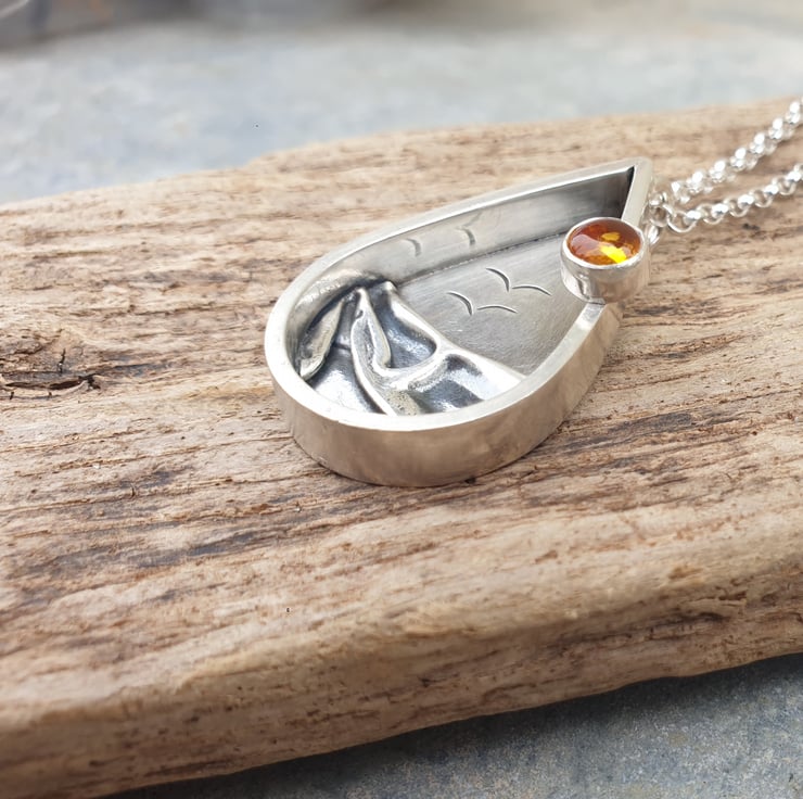 This statement piece is handmade in sterling silver to create a three dimensional beach scene with sea, an amber sun and seagulls. It measures approx 38mm x 23mm x 5mm deep and comes complete with a sterling silver belcher chain which fastens with a bolt clasp.