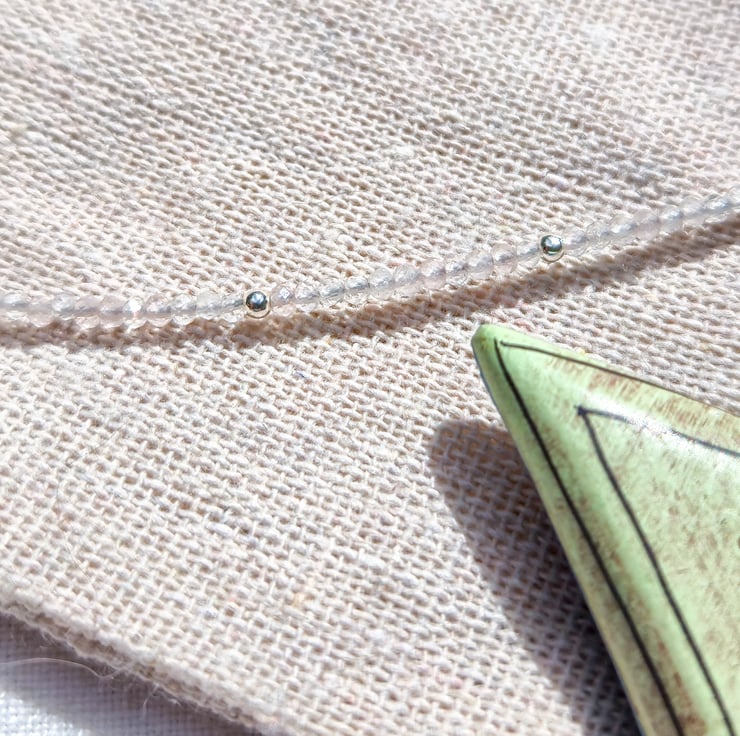 I’ve carefully chosen beautiful hand-faceted light pink Rose Quartz beads (3mm) and paired them with teeny tiny baroque ivory freshwater pearls – often affectionately called “rice crispy” pearls thanks to their sweet little shape.