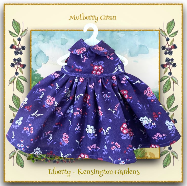 A beautiful little Liberty print dress in a purple Kensington Gardens print, to fit the Mulberry Green characters. The dress is made from best quality cotton and has a Peter Pan collar and a lined bodice.