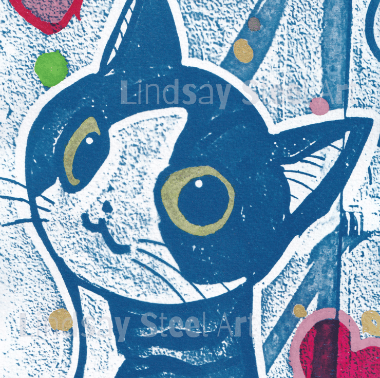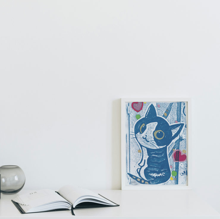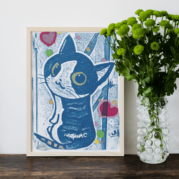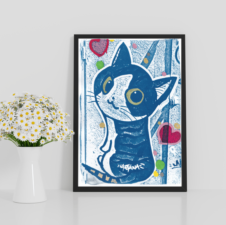 I have made this mixed media cyanotype from a photograph of some graffiti I took on my phone in Crete, Greek last year on holiday. By creating a digital negative of my photograph I have used one of the oldest photographic techniques to transform in into this print. I have then used watercolour, acrylic pen and Promarkers to add some colour to the cat.