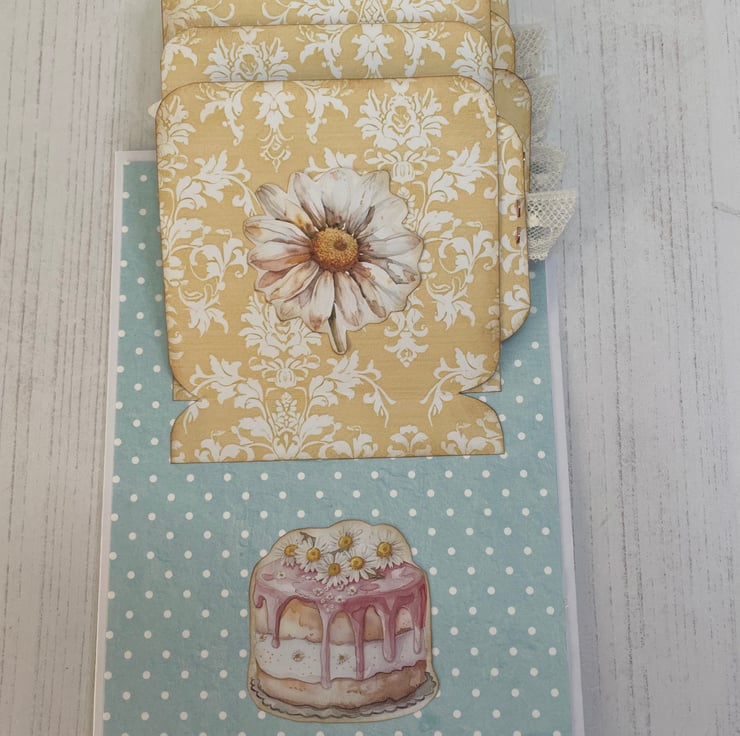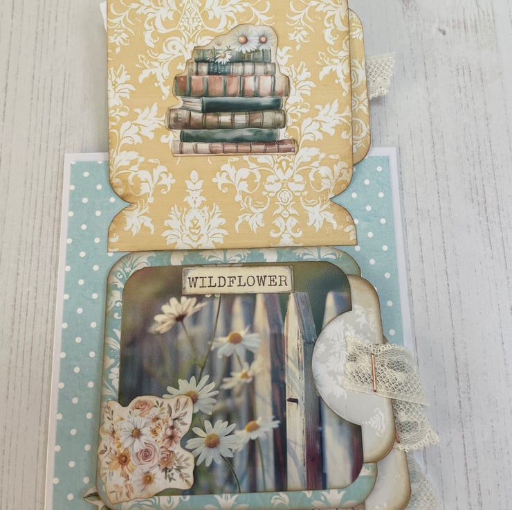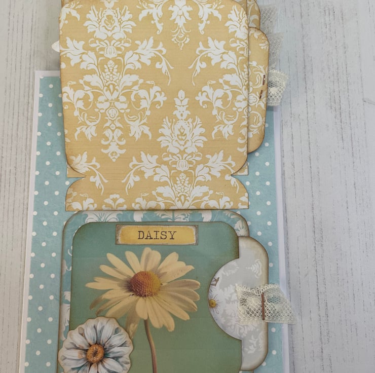 5” x 7” white card blue background with white polka dots. Vintage blue scroll card design makes a four waterfall flip. Each waterfall has a floral pocket with tag and lace tops. Fussy cut florals embellish the toppers. Sentiment Happy Birthday. The inside of the card has been left blank for your own message.
