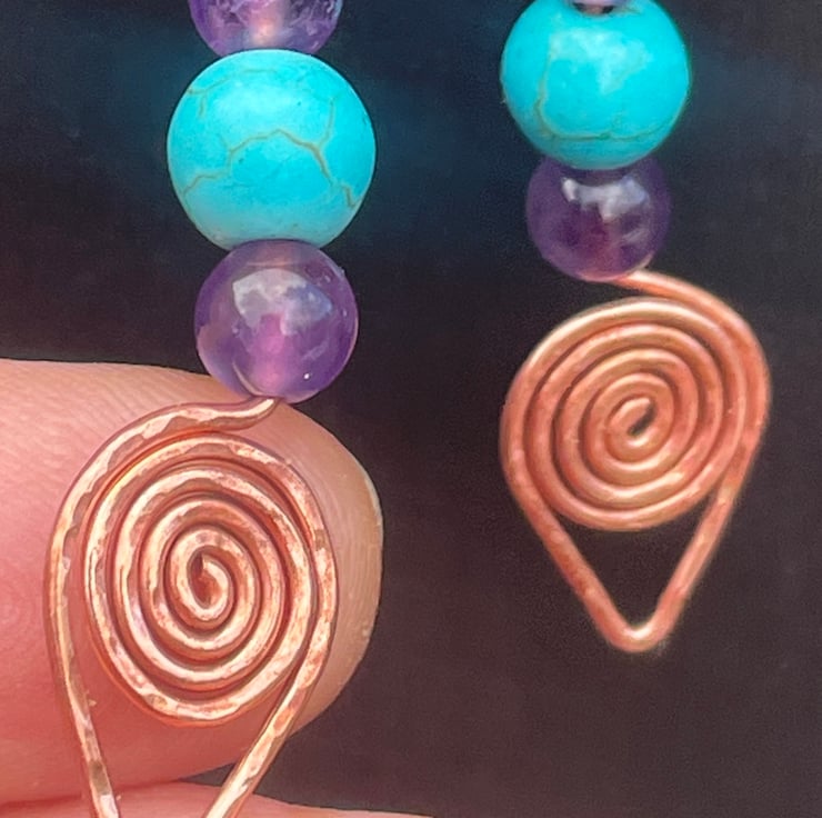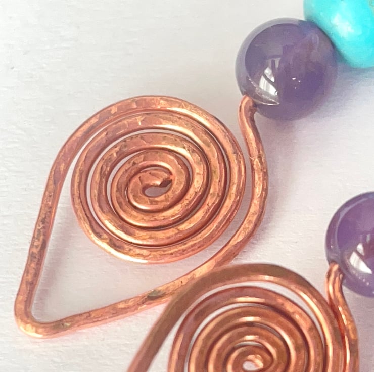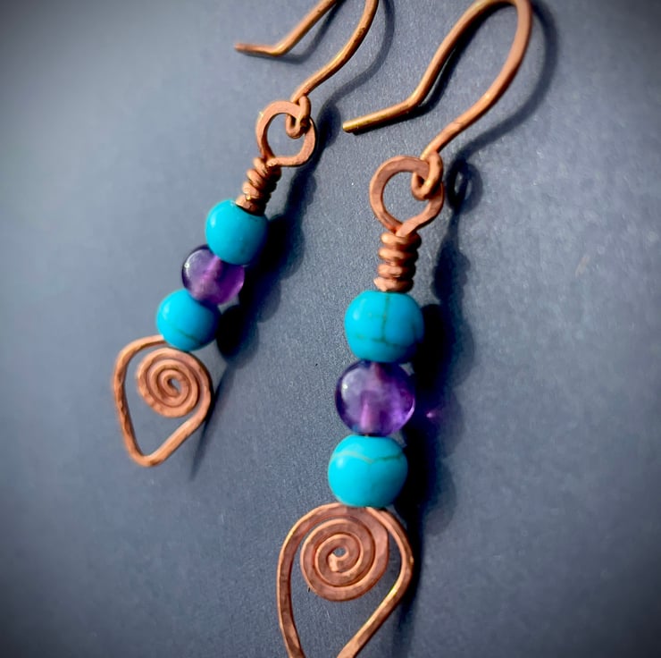 Lightweight and comfortable for everyday wear, they carry the ancient symbolism of copper spirals—echoes of cycles, energy, and renewal. Turquoise howlite offers truth and protection, while amethyst brings intuition and peace.