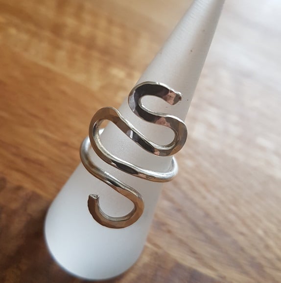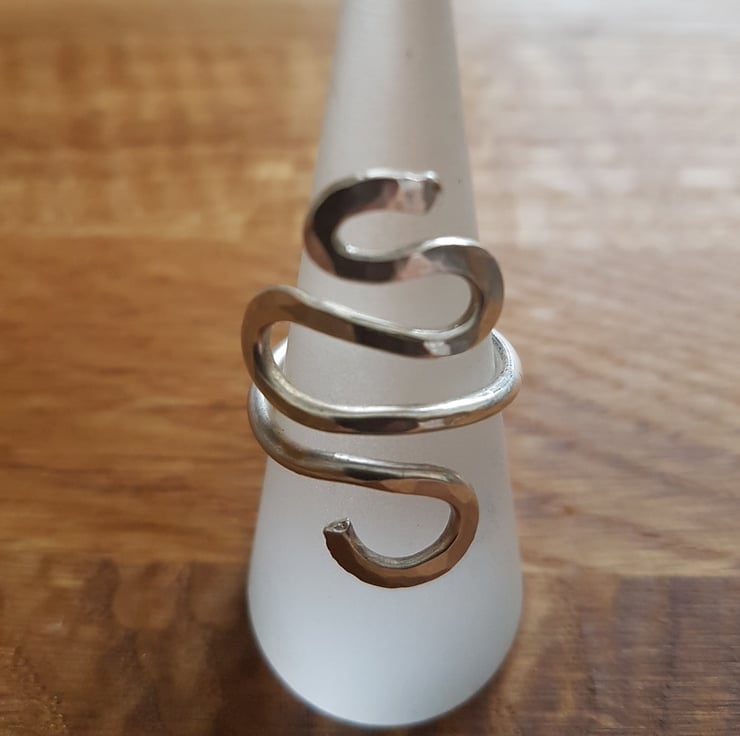 Handmade sterling silver ring, using recycled silver wire, that has been shaped, textured and polished by hand.
