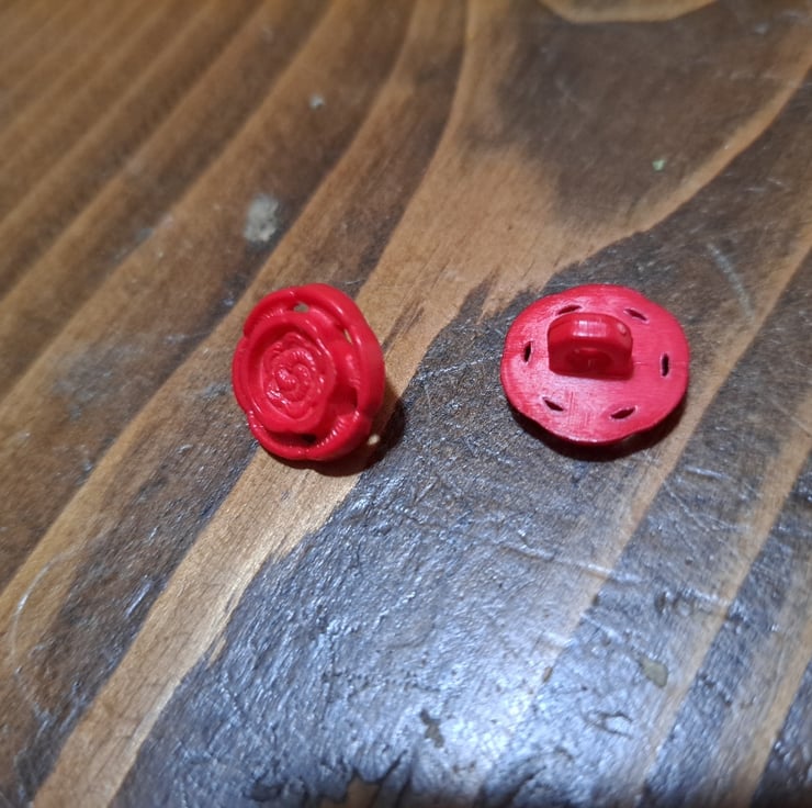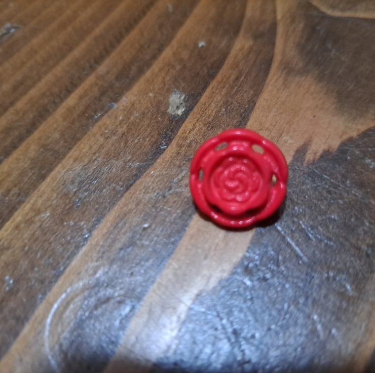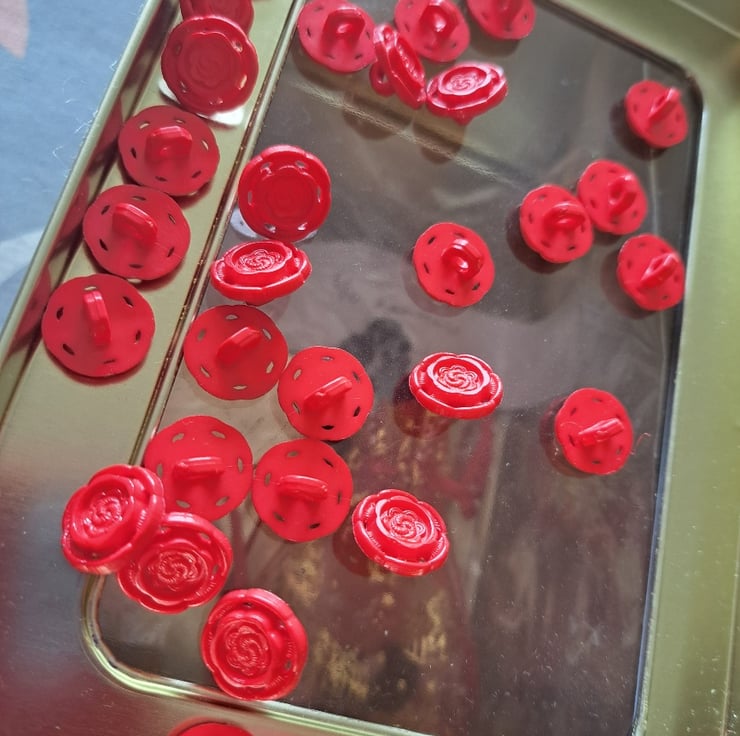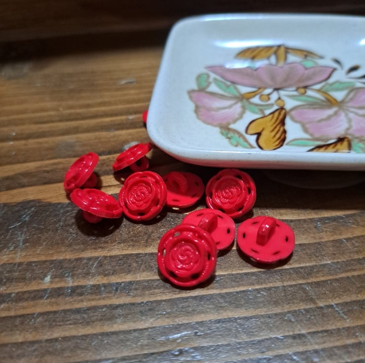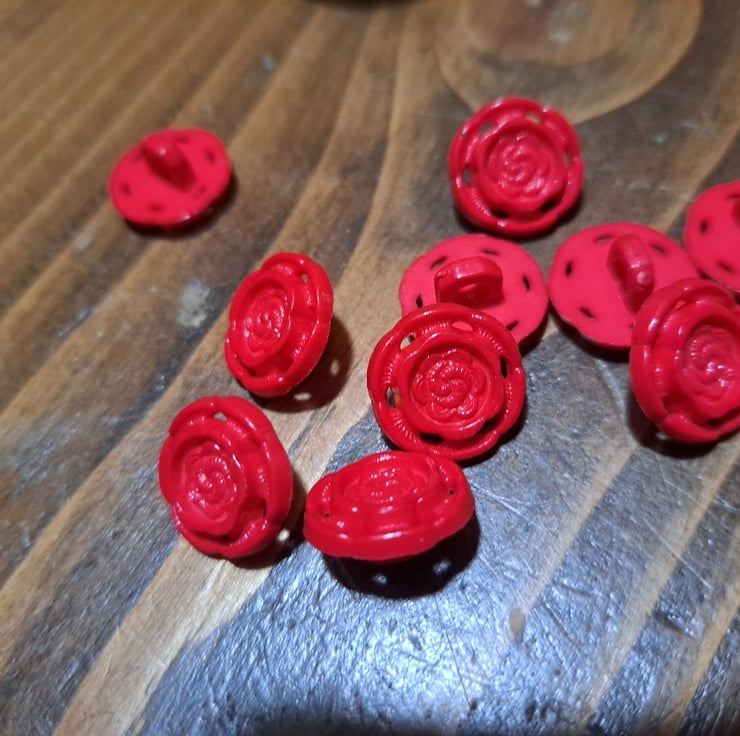 Thirty bright red plastic rose-shaped buttons. Or maybe they're not roses. I'm not sure. But they're definitely vintage and they're definitely sweet. 1.5cm in diameter and with shanks rather than holes.