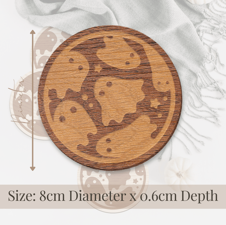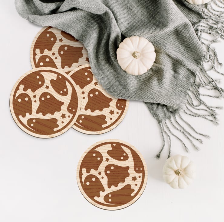 Expertly crafted from high-quality wood, these coasters are available in a variety of wood types to match your decor. Each coaster is precision laser-engraved with a cute ghost design, ensuring a crisp and detailed finish that is both durable and eye-catching. Whether you're sipping a pumpkin spice latte or enjoying a cosy evening with friends, these coasters add a whimsical touch to any setting.