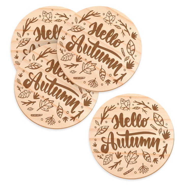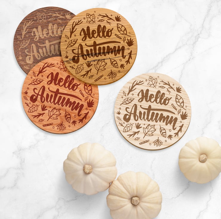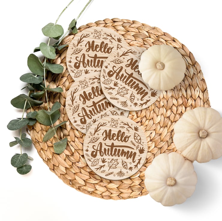Welcome the cosy vibes of the season with our beautifully crafted set of 4 "Hello Autumn" coasters. Perfect for adding a touch of fall warmth to your home, these coasters feature an elegant design with the phrase "Hello Autumn" surrounded by an acorn. Whether you're enjoying a hot cup of hot chocolate or hosting a festive gathering, these coasters are the ideal accessory to celebrate the beauty of autumn.
