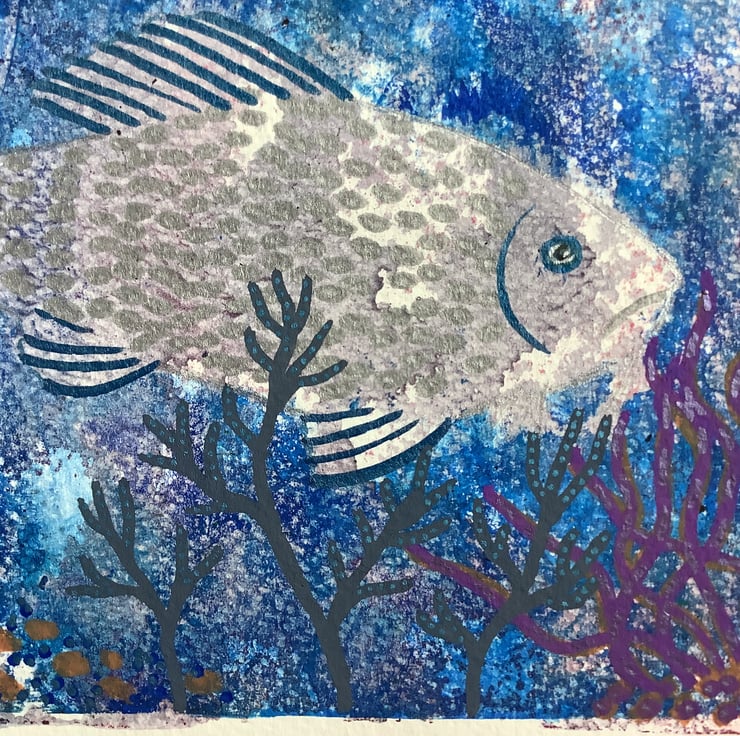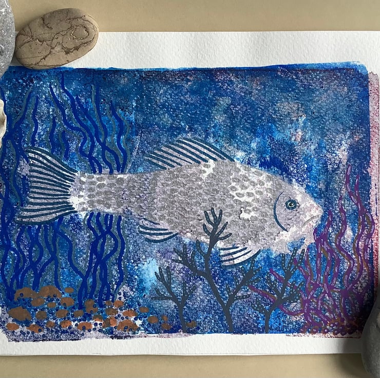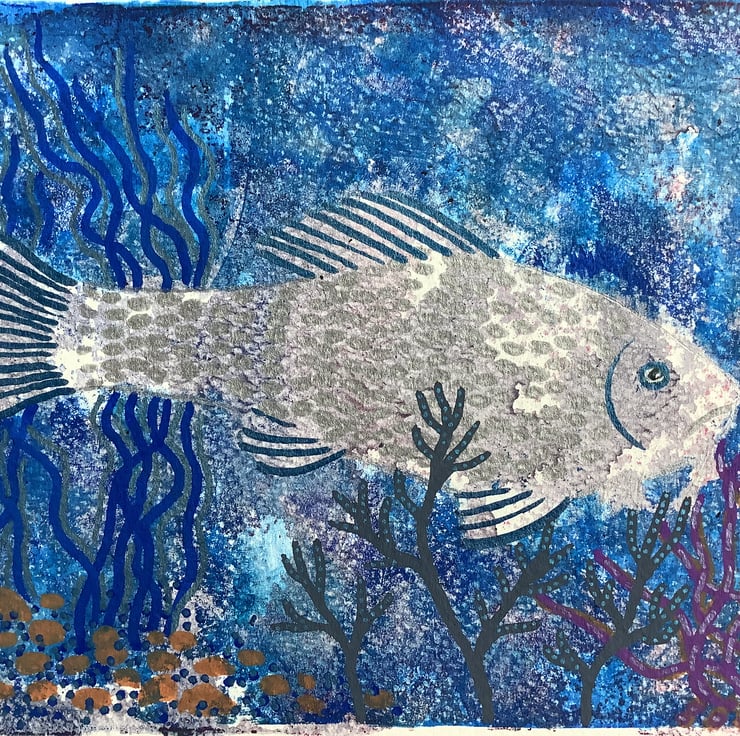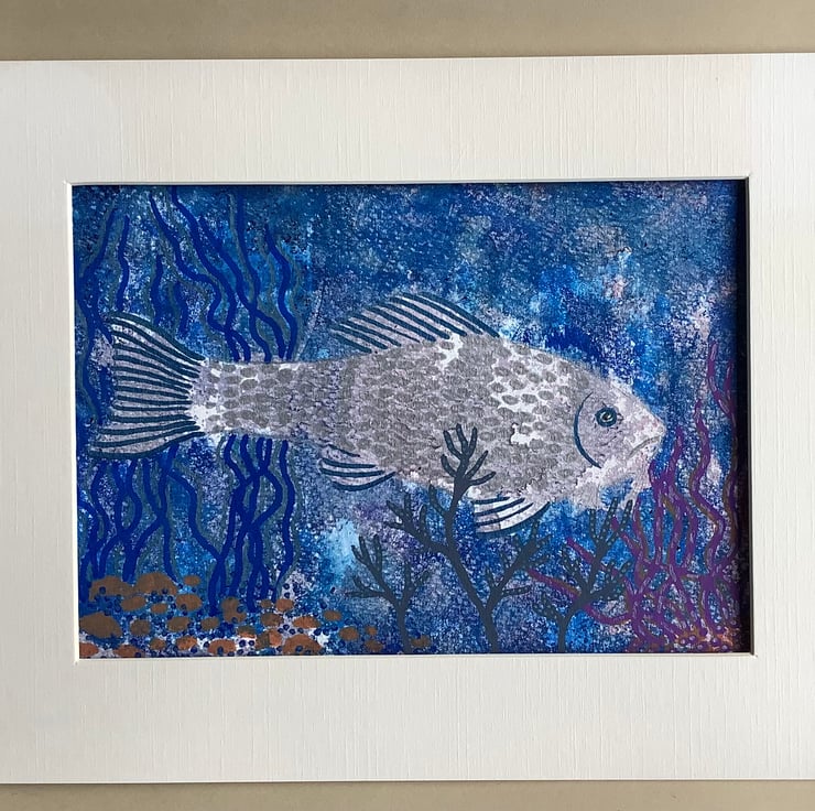 Hand pulled on a gelli plate using acrylic paint on watercolour paper, this is a unique print of a fish. It has been further embellished using acrylic pens. Included is an off white mount measuring 22.5 x 17.5 cms (9” x 7”), which can be fitted in a shop bought frame of your choice in that size.