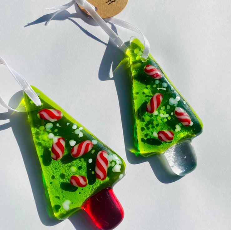 Each tree is slightly unique with clear or red pot and candy canes and snow.