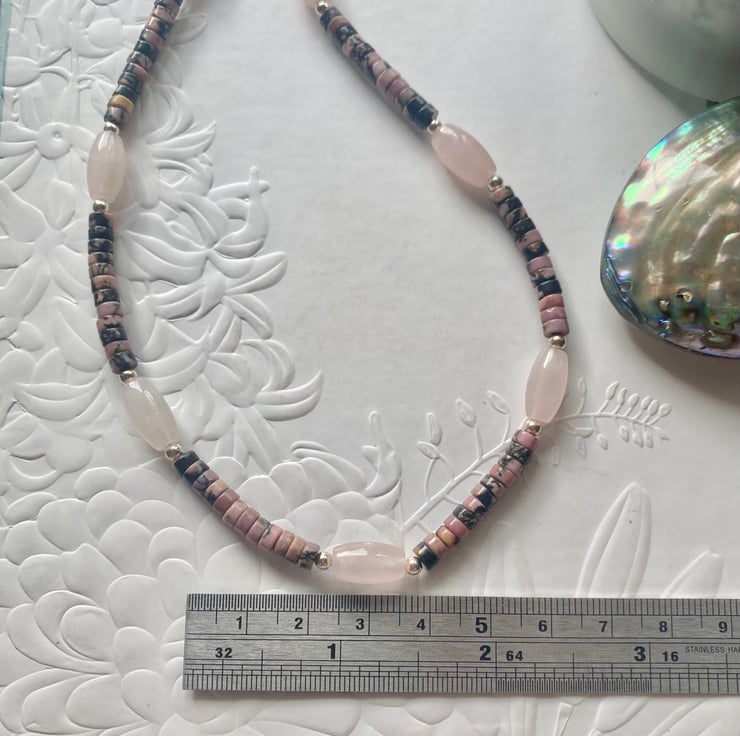A lovely handmade necklace featuring Rhodonite Heishi shaped beads and Rose Quartz rice beads. Each gemstone section is separated by a 925 sterling silver bead and I have finished the necklace with an etched 925 sterling silver toggle clasp making it easy to fasten. I have added a cute sterling silver puffy heart charm to the back of the necklace. The Necklace is approximately 18in in length.