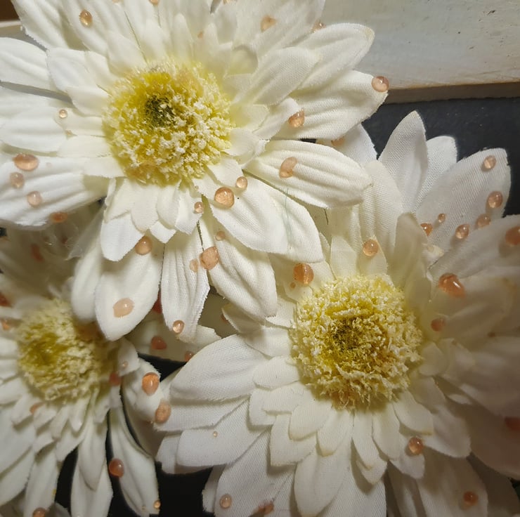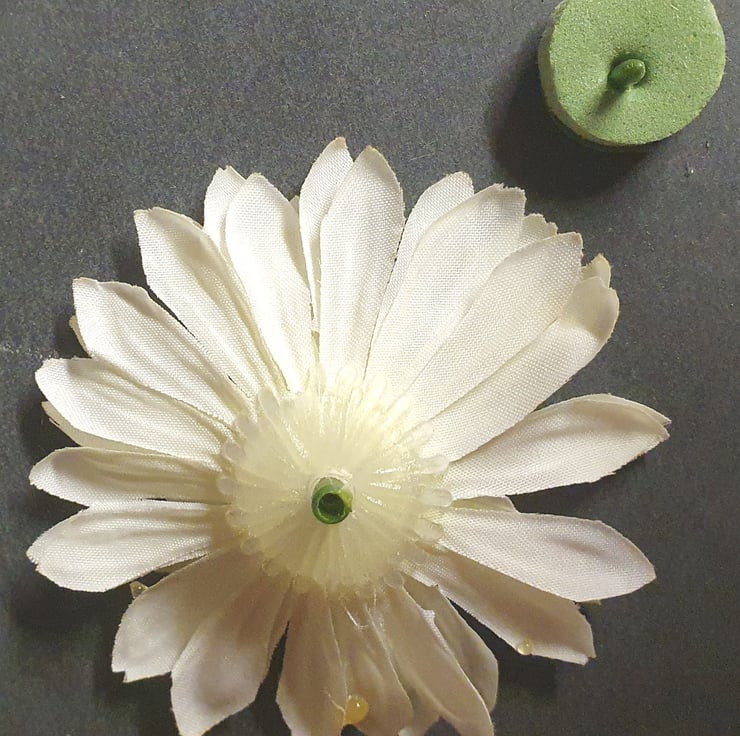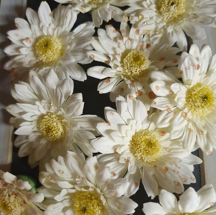 Ten pretty fabric daisies with 'water droplets' on them. Each has a push-clip on the back to make them easy to add to something (see third picture). I bought them for adding to cards or making wreaths but never did either. They'd also be great for a bridal headdress or for bridesmaids or to add to a pinboard or around a mirror.