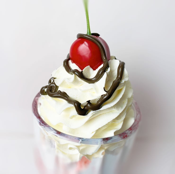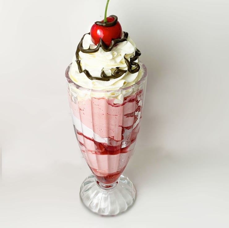 Relive the delightful memories of classic sundaes with this Fake Food Art Knickerbocker Glory. Crafted with meticulous attention to detail, this life-sized dessert showcases a glass dish brimming with resin jelly, fake fruit. Crowned with swirls of fake whipped cream, and a cherry on top, it's a decadent delight that will transport you back to your childhood.