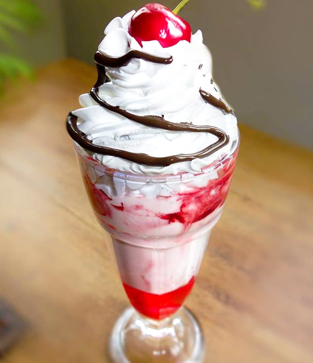 Topped with vanilla ice cream, whipped cream, and sprinkles