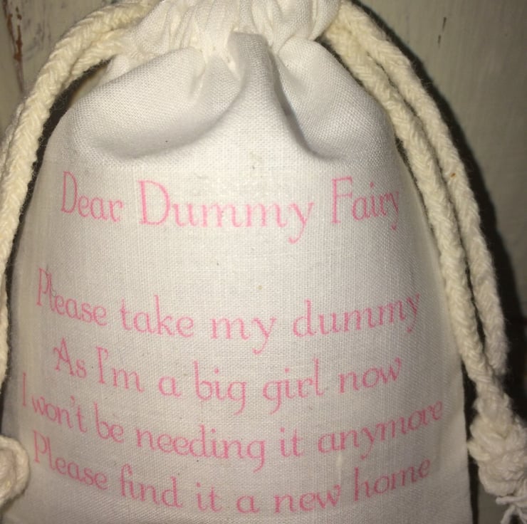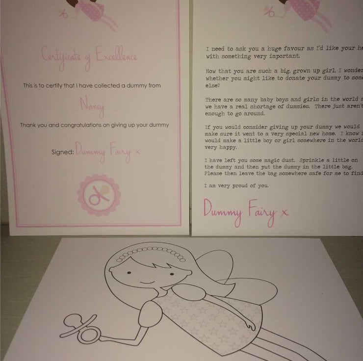In addition you will get a letter to leave the child, a personalised certificate, a picture of the Dummy Fairy to colour in, a 55mm badge, a tiny bottle of co-ordinating Dummy Fairy dust (colour may vary), a follow up letter telling the child that their dummy has found a new home etc. and 4 reward vouchers.