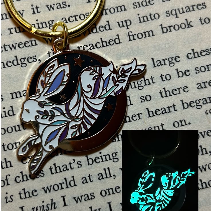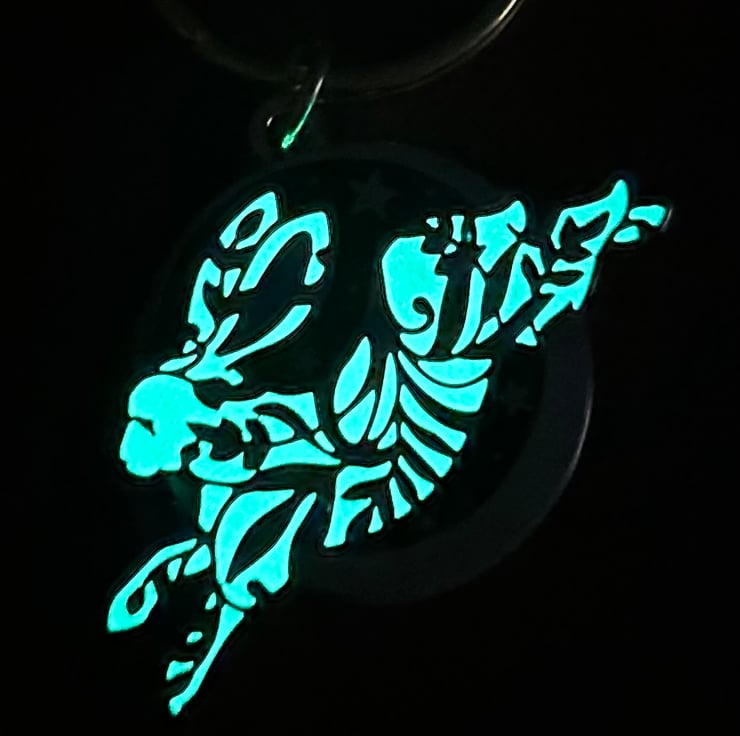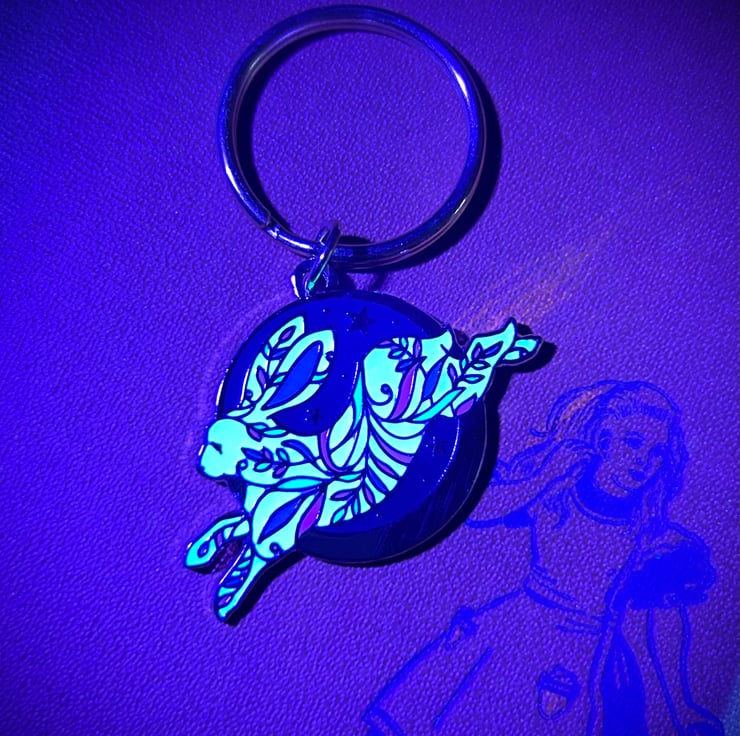 Each keyring is made from hand painted hard enamel using six colours over gold. The white part is UV reactive AND glows in the dark, and it’s especially potent after exposure to light. There’s two fasteners on the reverse.