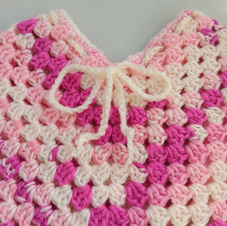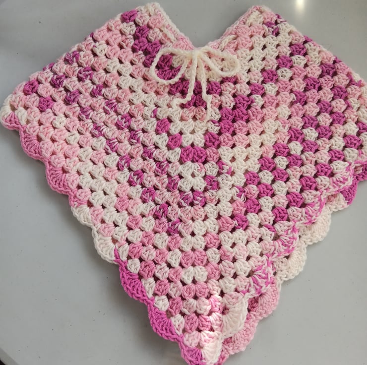 Handmade child's poncho (2-4 years) with pretty ribbon bow tie and scalloped edging.