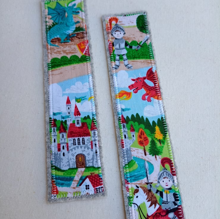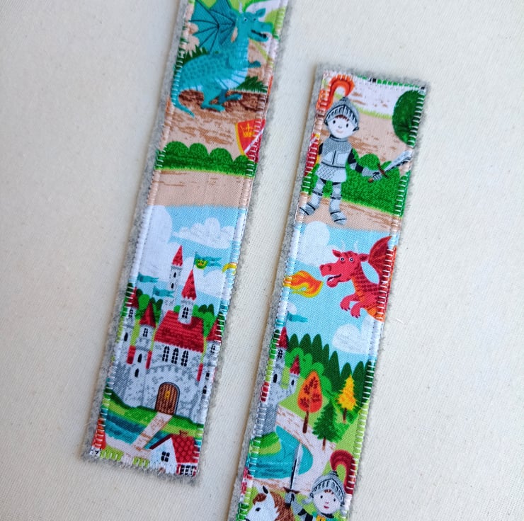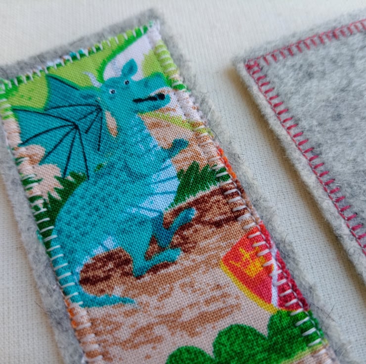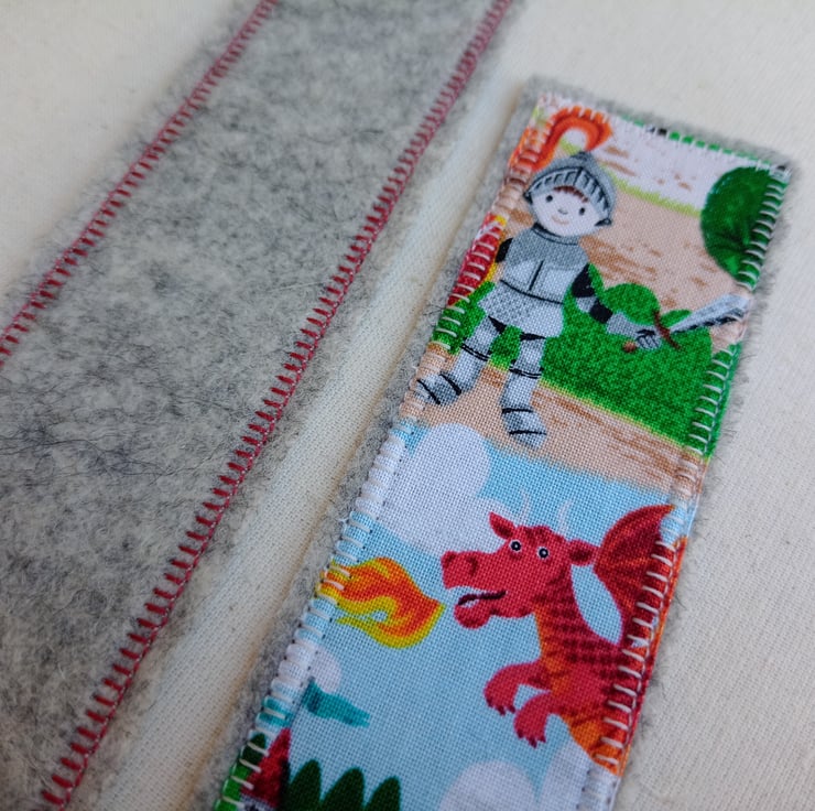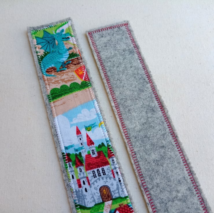 The fabric for these bookmarks is a fantastic dragon and knight village scene, and you can choose from a red dragon with a castle, or a blue dragon with a knight. The fabric panel is fused to a soft grey pure wool felt backing, and securely machine sewed all the way round with a decorative buttonhole stitch in a contrasting thread.