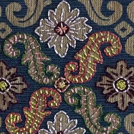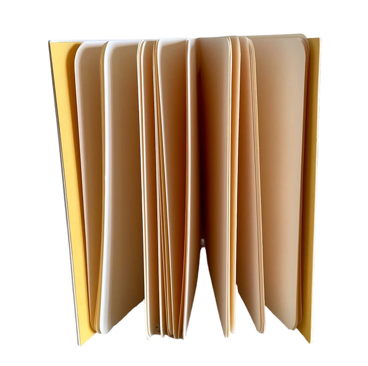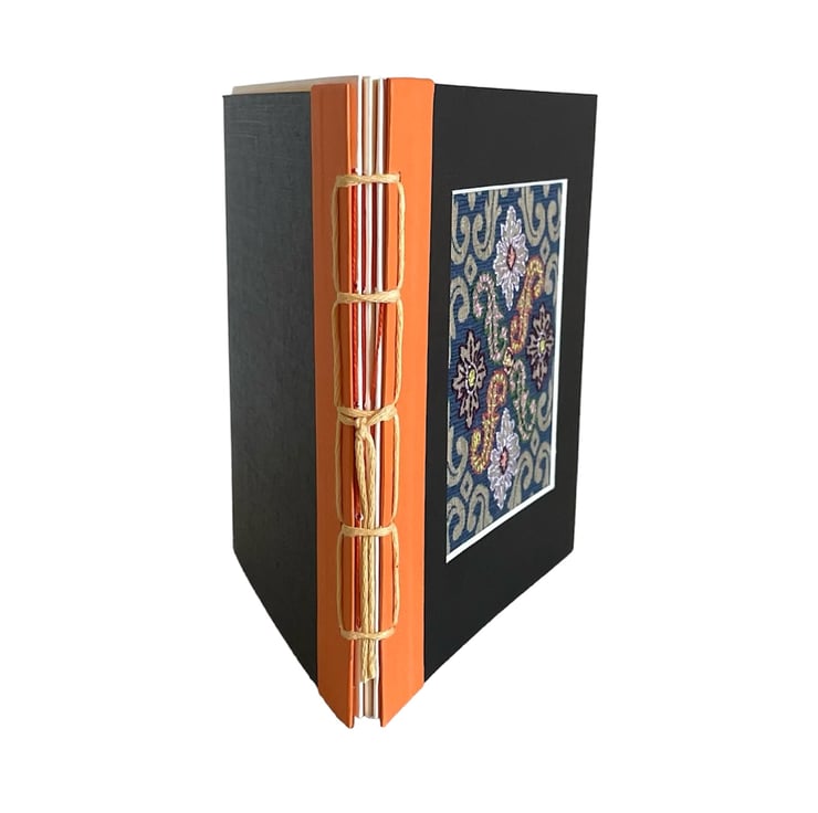 This notebook is hand constructed from a strong cardboard mount incorporating a hand embroidered swatch. It contains three book blocks of premium writing paper which are hand stitched to the spine.