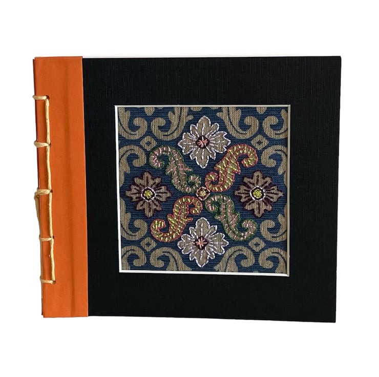 The paper has rounded corners and the cover is decorated with a hand embroidered fabric swatch.