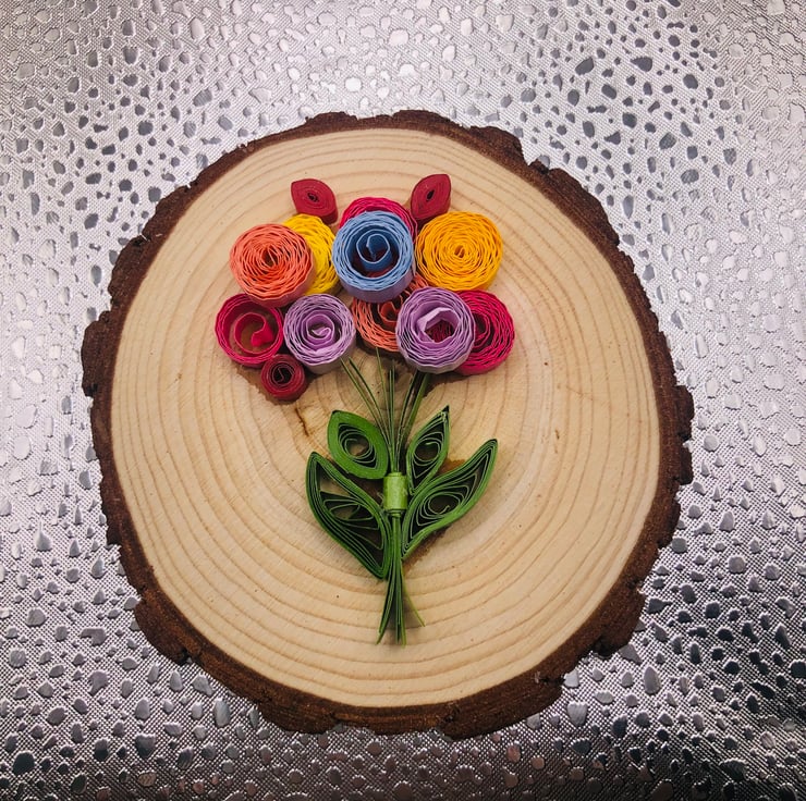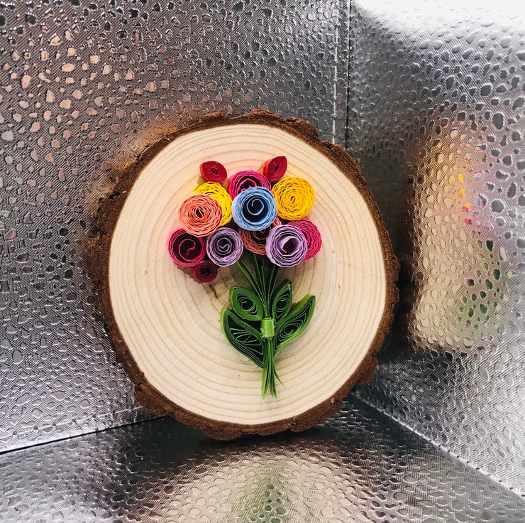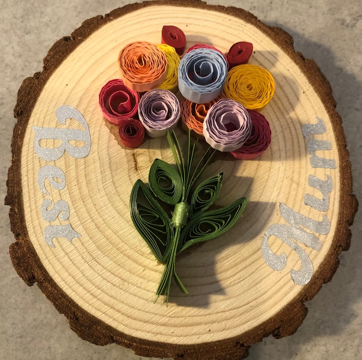 This is a wooden slice approximately 4 ins with quilled bouquet of flowers all made from paper . It’s a lovely little gift for someone . I can add mum,teacher,friend,or a name for or a sentiment like happy birthday for example on the front or back . The back is blank but can add a small message. Lovely token gift for teacher friend or family .