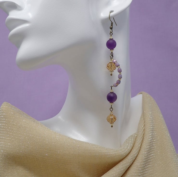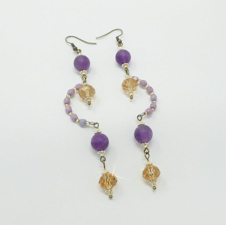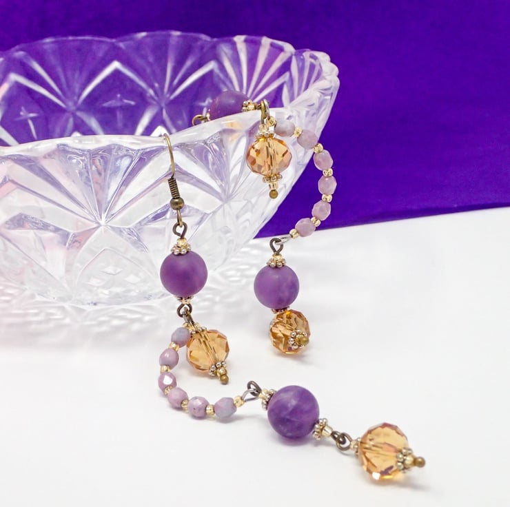 These long dangly, vintage style earrings feature gorgeous natural Frosted Amethyst gemstone beads. Champagne gold faceted glass rondelle beads add a touch of subtle sparkle to this design! They measure approximately 11.5cm long including the hooks.