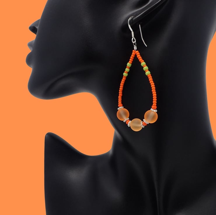 Bright orange teardrop hoop earrings made with seed beads with a touch of apple green and a trio of transparent frosted glass beads. The decorative flower spacers in between the frosted beads are silver plated and nickel free. The earring hooks are sterling silver.