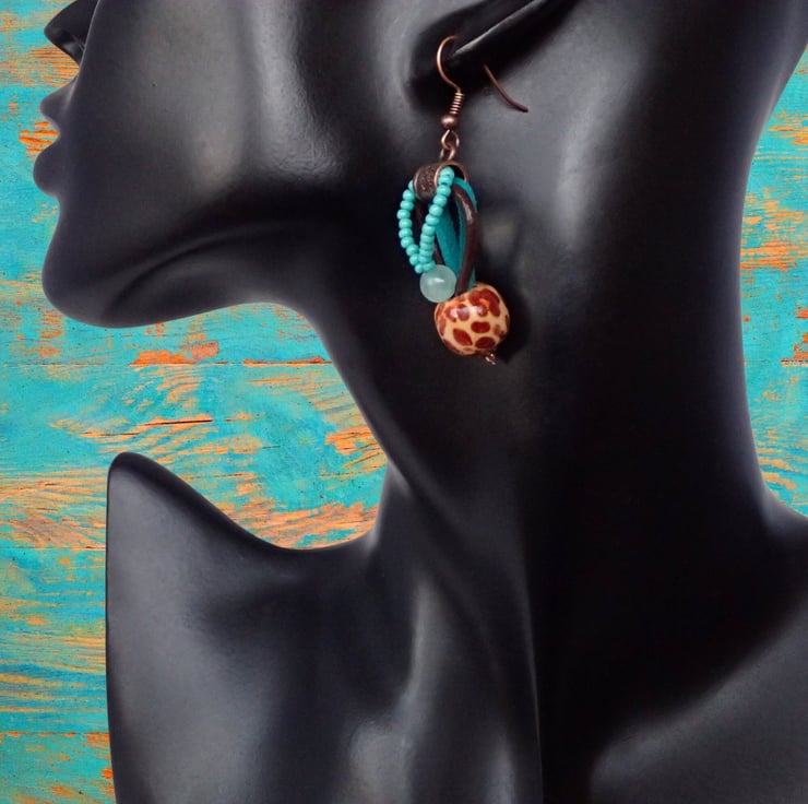 These brown and turquoise boho earrings feature glass seed beads, wooden animal print beads, dark brown leather and Malaysian jade gemstones. The beads are threaded onto stainless steel wire. They are lightweight earrings to wear and have a drop length of approximately 5.5cm.