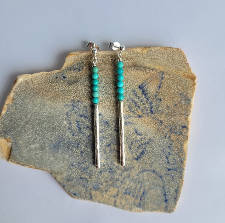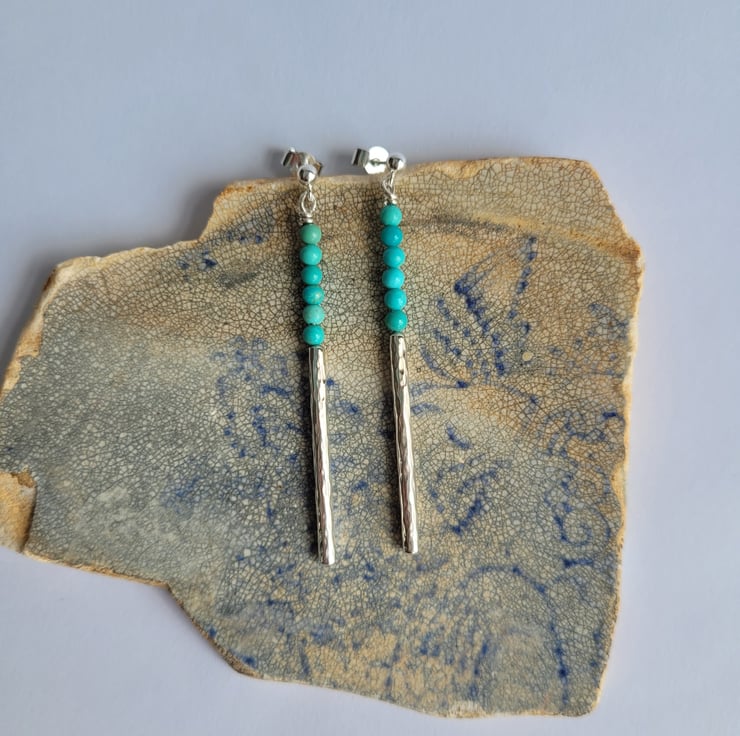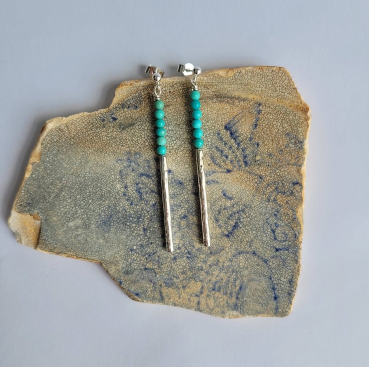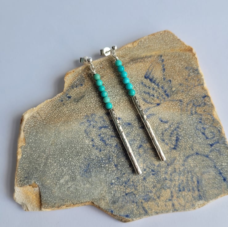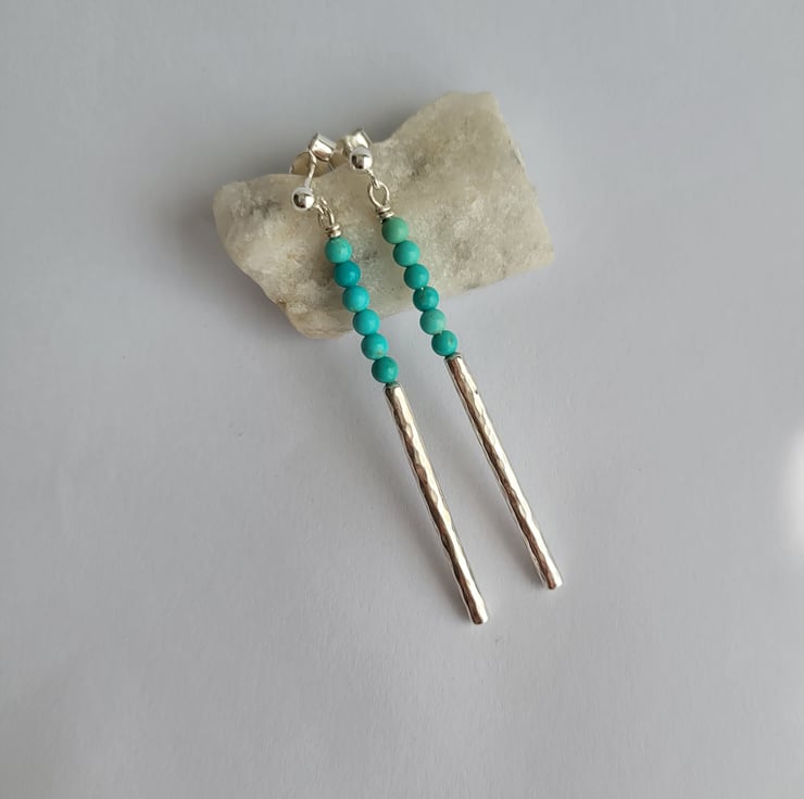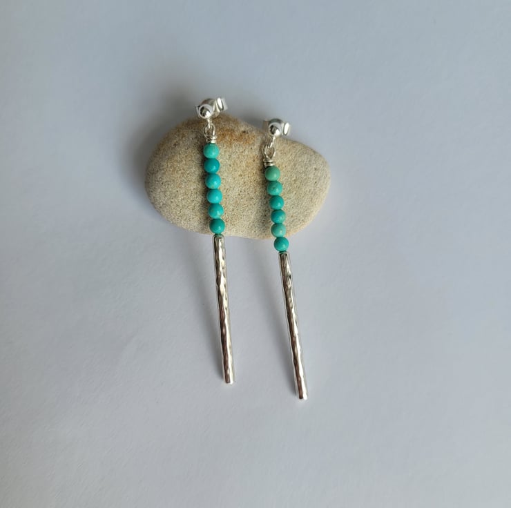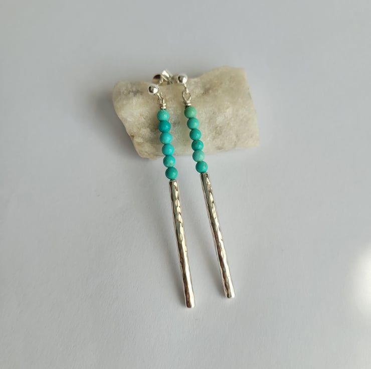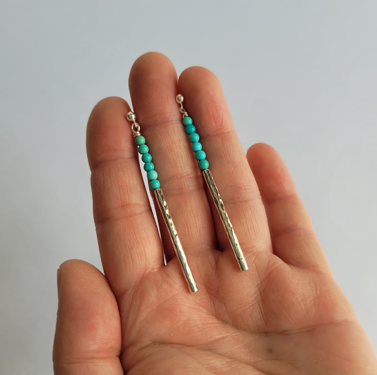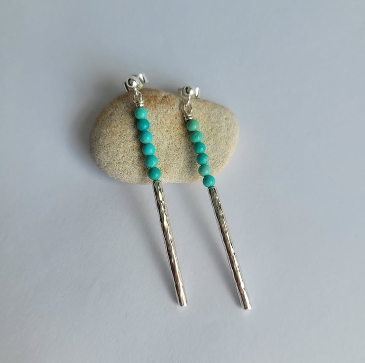The hammered bar has been handmade by hammering all around 3cm lengths of 0.2cm round recycled sterling silver wire. a thinner recycled sterling silver wire has been soldered onto the top so that the tiny turquoise beads can be threaded on and the wire wrapped around to attach the recycled sterling silver ball earring posts.