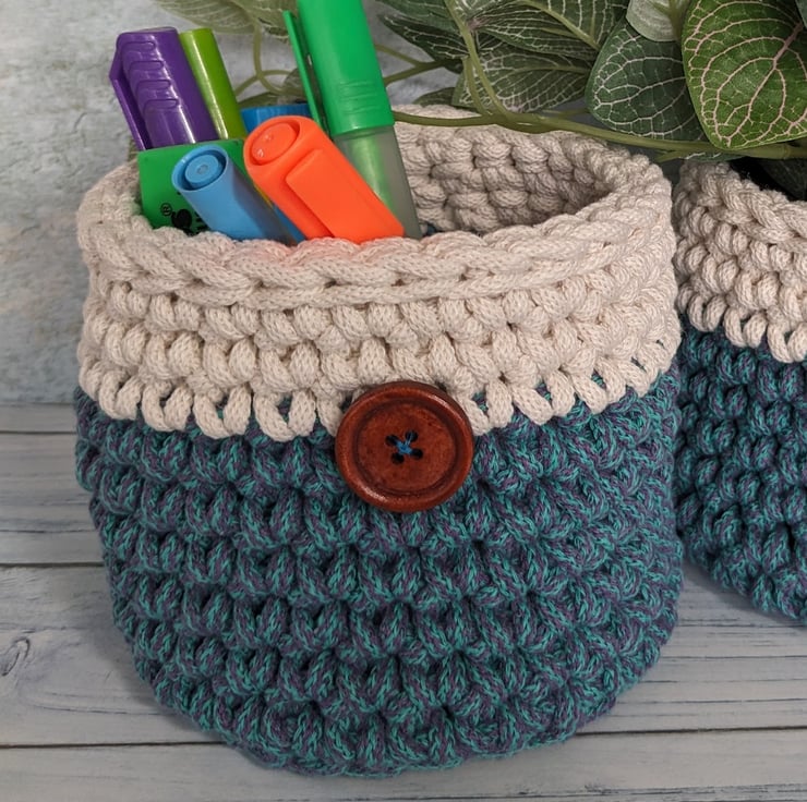 An attractive crocheted plant pot cover or desk tidy, made with premium quality recycled braided cord. I have used an unusual variegated colour cord in shades of teal and purple at the base, combined with ecru at the top. The container is flexible yet keeps its shape and the cord gives great definition to the crochet stitches used to create it. It has a slip stitch crocheted top edge making it both sturdy and decorative. it also features a wooden button, hand sewn on the side as a special finishing touch.