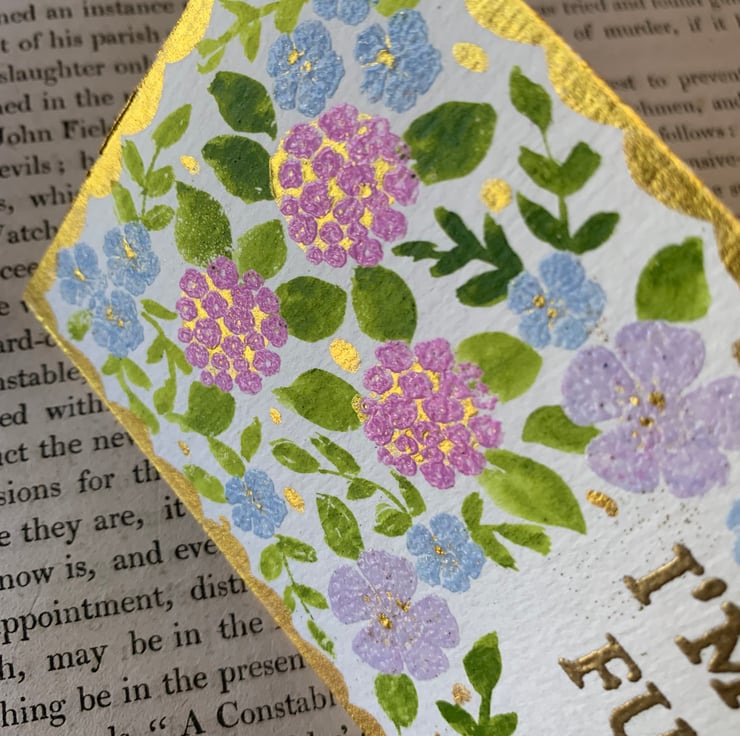The design is very pretty, using a combination of embossed and hand painted elements. The metallic watercolour adds a beautiful shimmer to each bookmark, especially to the scalloped border