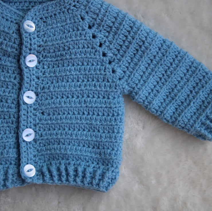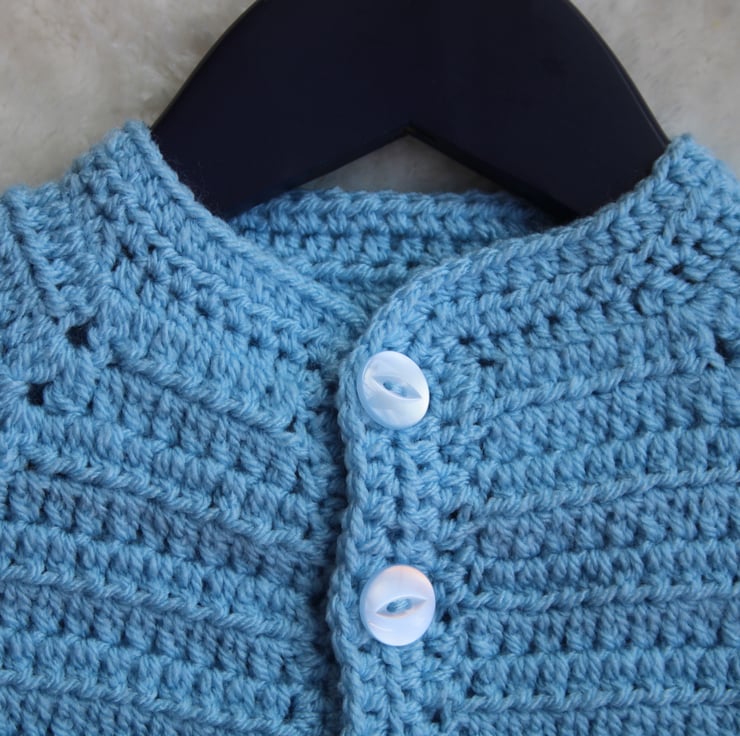 This cardigan is crocheted using a double knit weight yarn and is long sleeved making it ideal for layering your baby during the cooler weather.