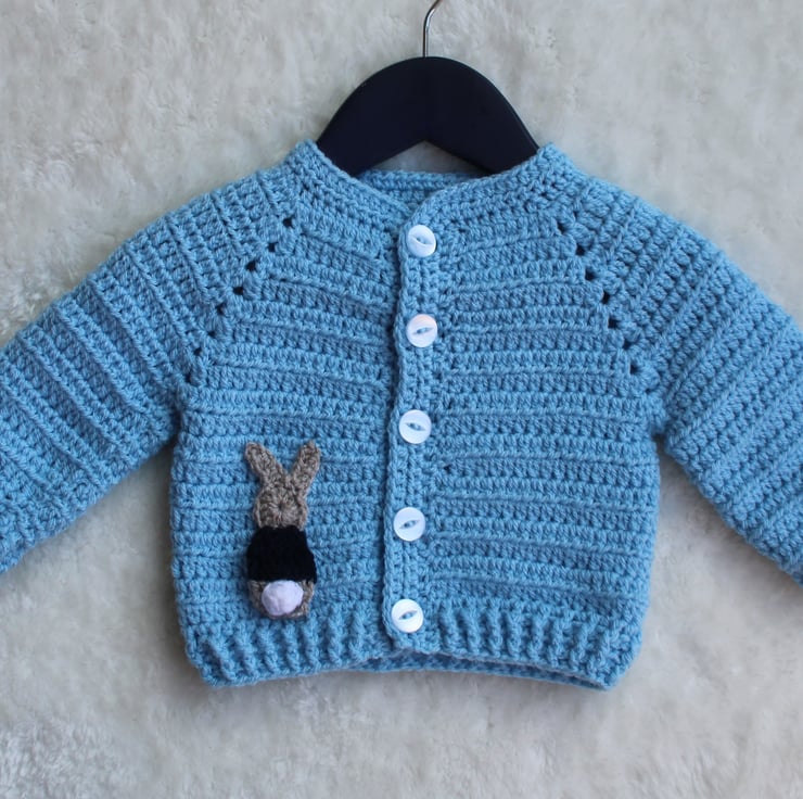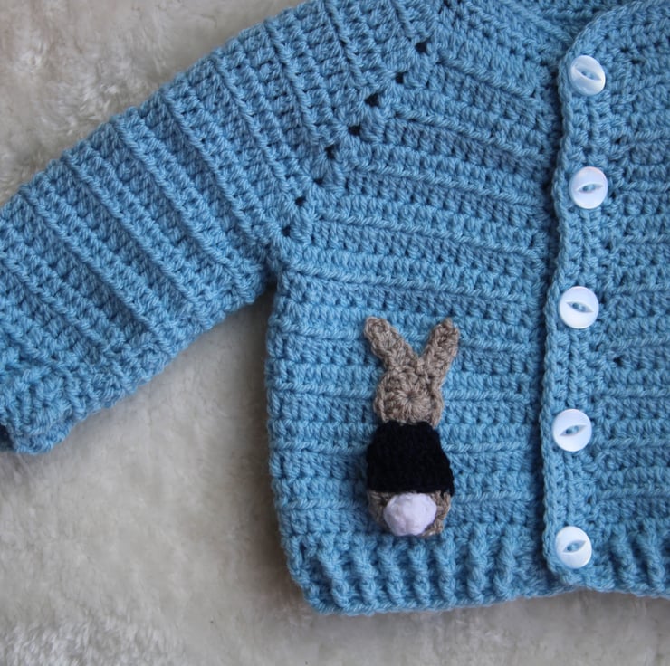 Features a crocheted bunny applique with a super cute bobble tail on the right side.