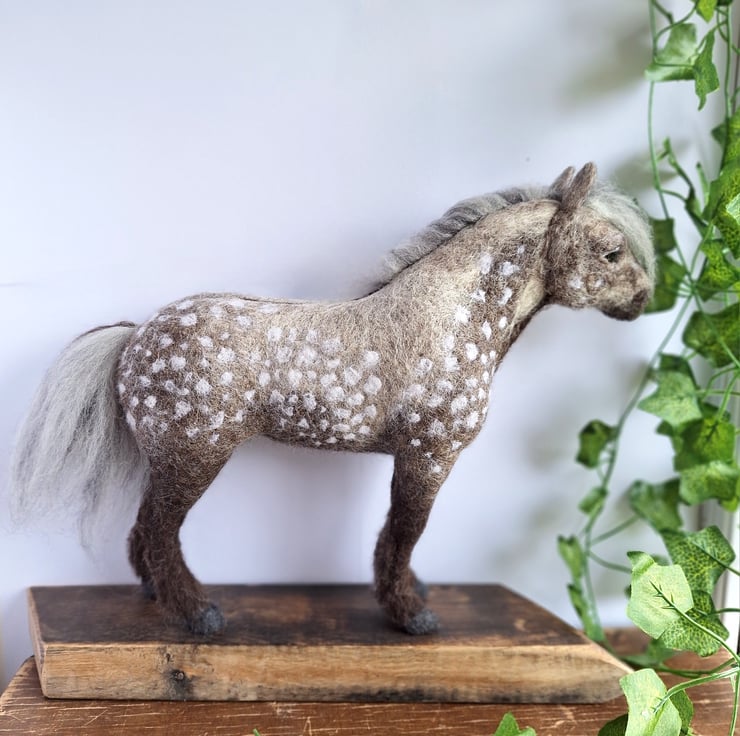 This unique piece is built around a wire armature for strength, and depicts a dapple grey Highland Pony. As I used to work with these hardy creatures, they are a subject close to my heart!