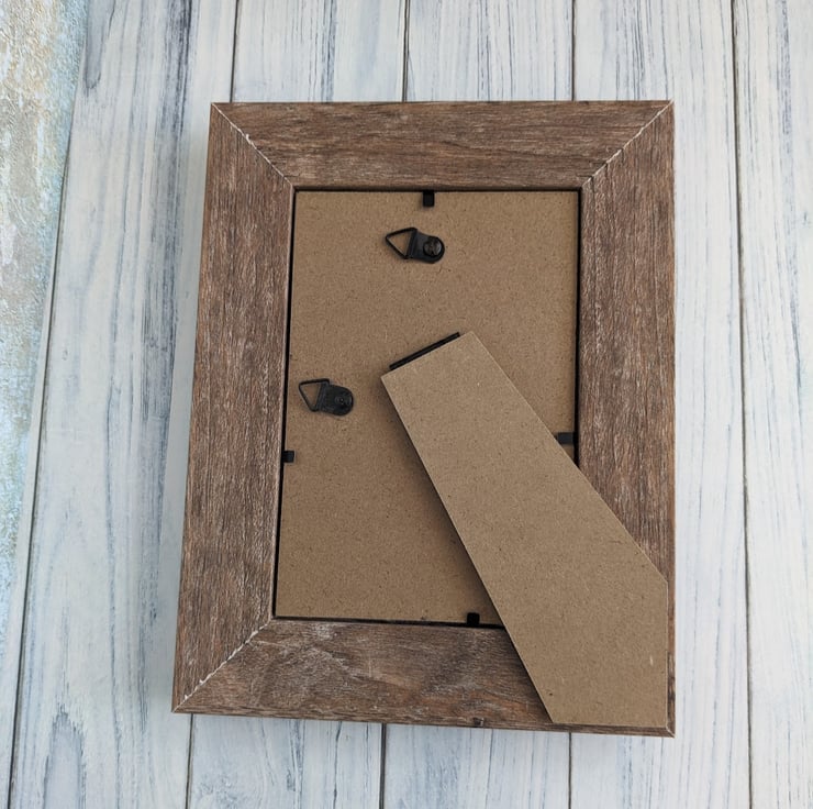 The actual artwork measures 9cm x 14cm. The frame measures 16.5cm x 21cm from edge to edge, with each side measuring 4cm across. The frame has a fold out strut on the back so can be displayed on a shelf or hung on a wall with the metal hook.