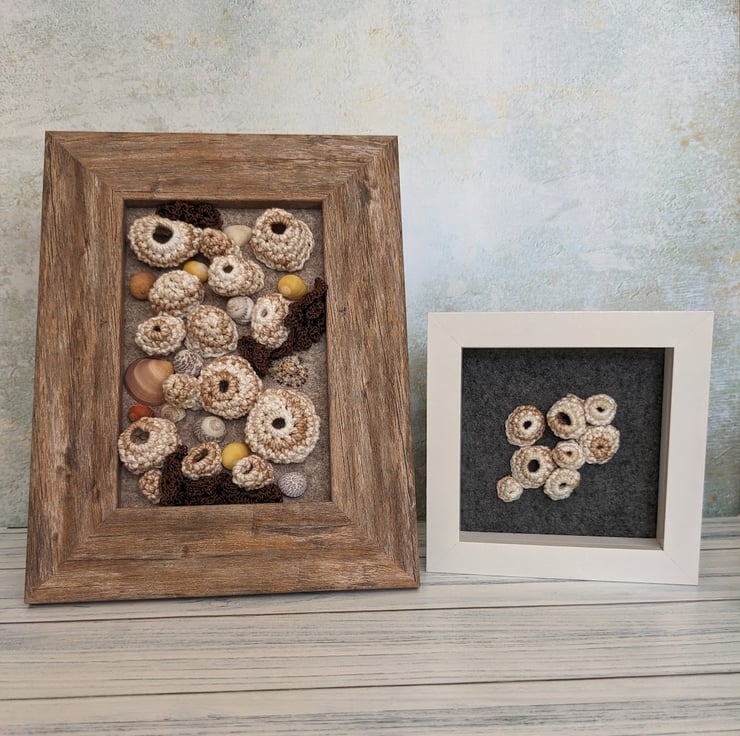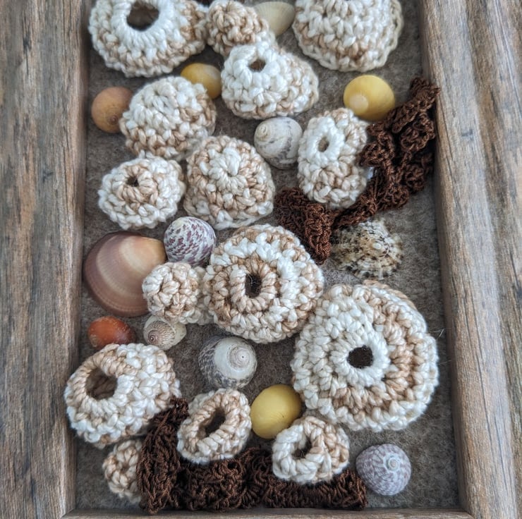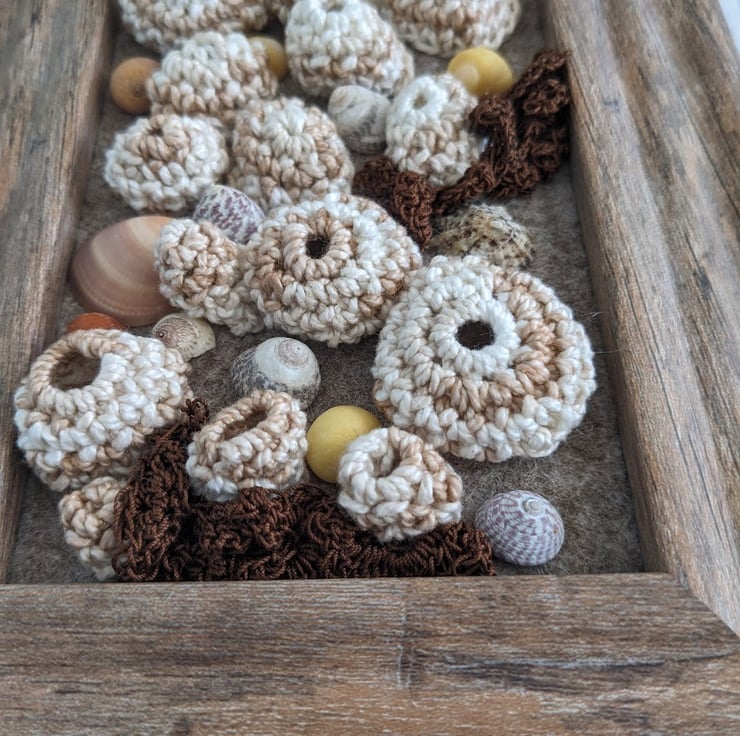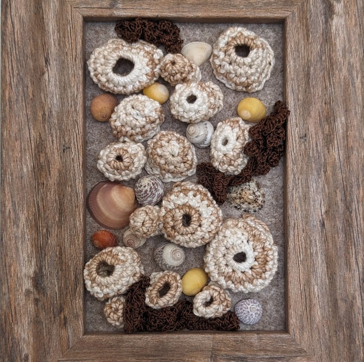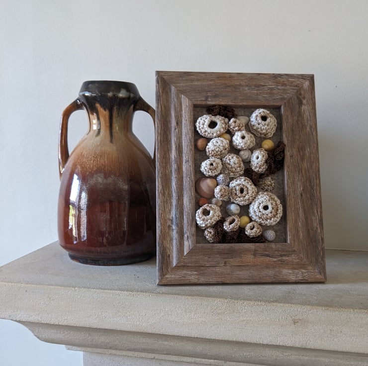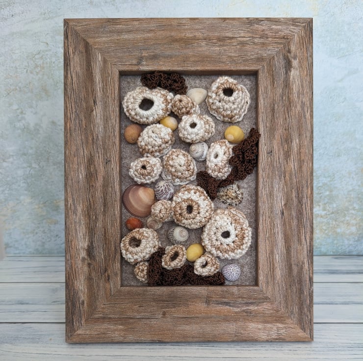 Rectangular crochet artwork that can be hung on a wall or displayed on a shelf. I love experimenting with the possibilities of crochet and this is an example of how stitches can be shaped into spheres that resemble barnacles and spirals that resemble seaweed. The crocheted items were sewn carefully into place onto the sandy brown felt background. I then added some pretty seashells, attached with strong jewellery glue, before securing in the frame, chosen because it reminds me of driftwood. The wood effect frame has no glass so the tactile nature of the artwork may also be enjoyed (with clean hands of course!).